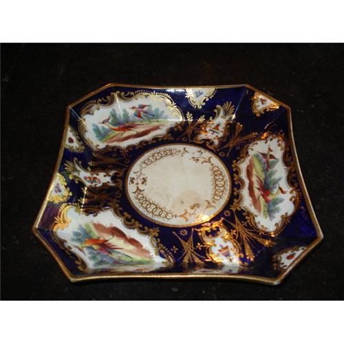 A Very Beautiful Soft Paste Porcelain Square Dish, Circa 1800, From Coalport Porcelain Factory, of England. Done in a Beautiful Shade of Rich Cobalt Blue with Panels of Brightly Colored Exotic Birds in Landscapes, ringed by Gilt Borders in an Exuberant Rococo Style. In Good Antique Condition. Please see my Other Listings for Companion Pieces in the Beautiful Pattern.