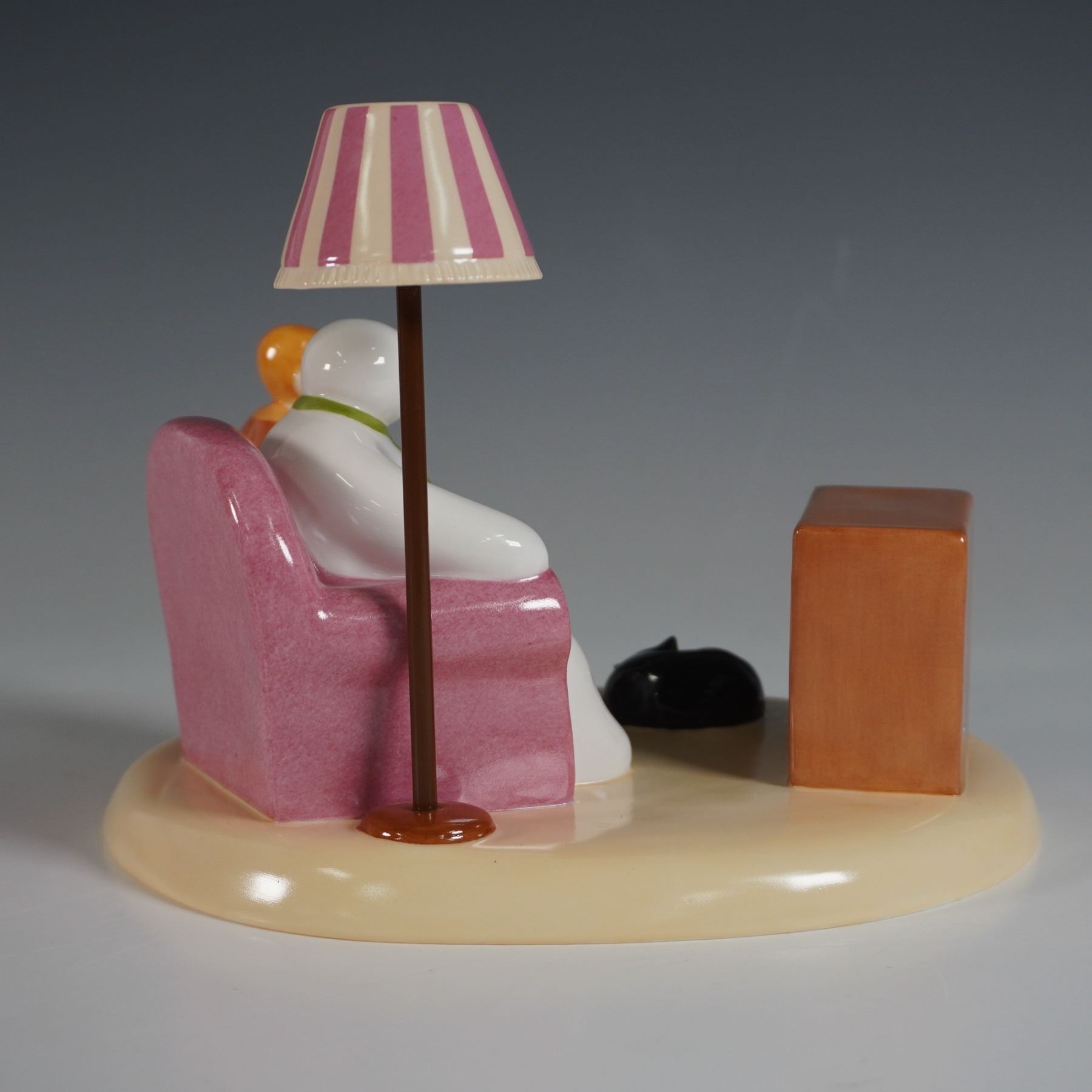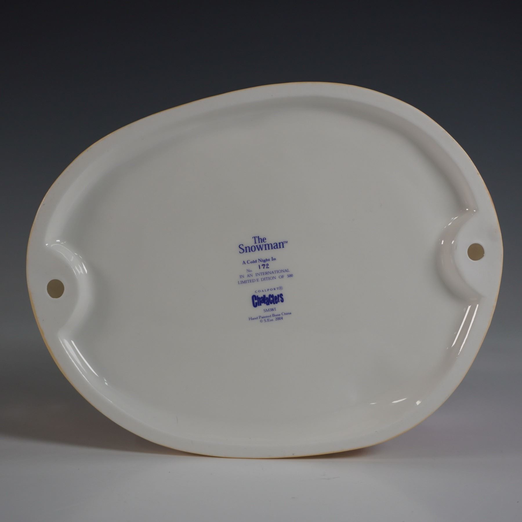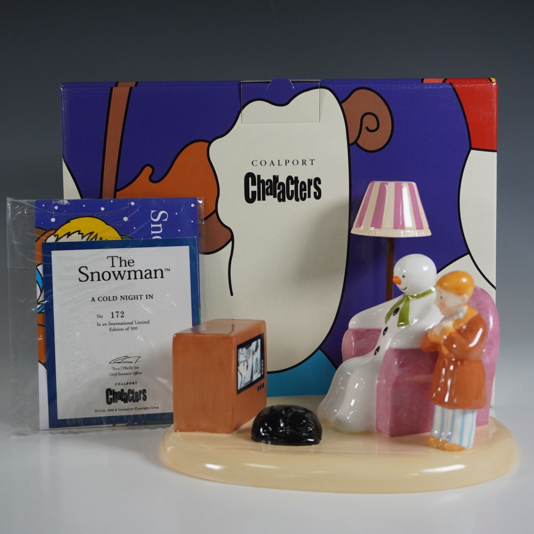 A limited edition porcelain figurine from The Snowman series, titled "A Cold Night In." This charming vignette captures the Snowman and a young boy watching television together, accompanied by a cozy pink armchair, striped lampshade, and a resting black cat. Produced by Characters and part of an international limited edition of 500, this piece is hand-painted and finely detailed. The base bears the official backstamp and edition information. Includes original box and certificate of authenticity.