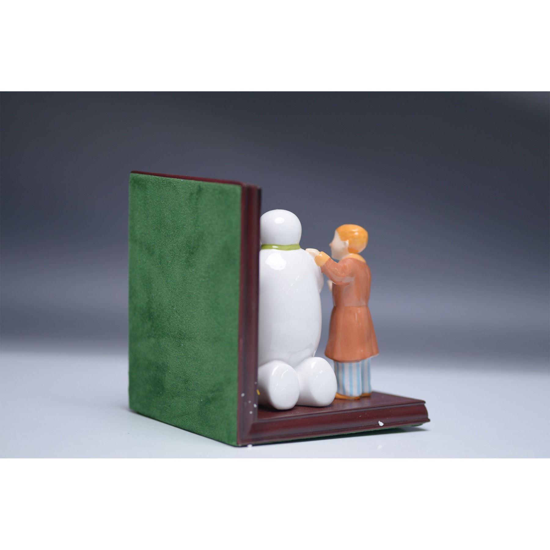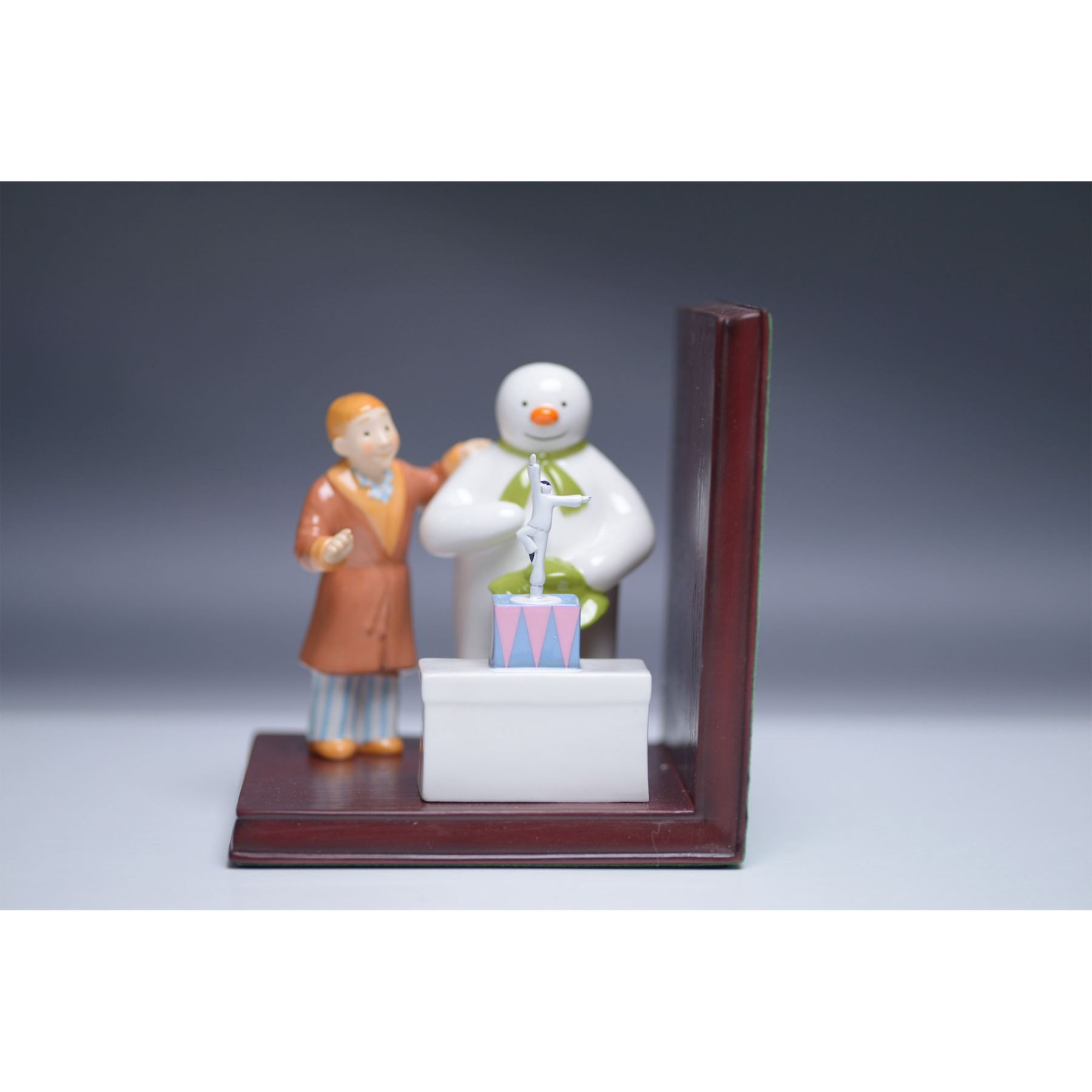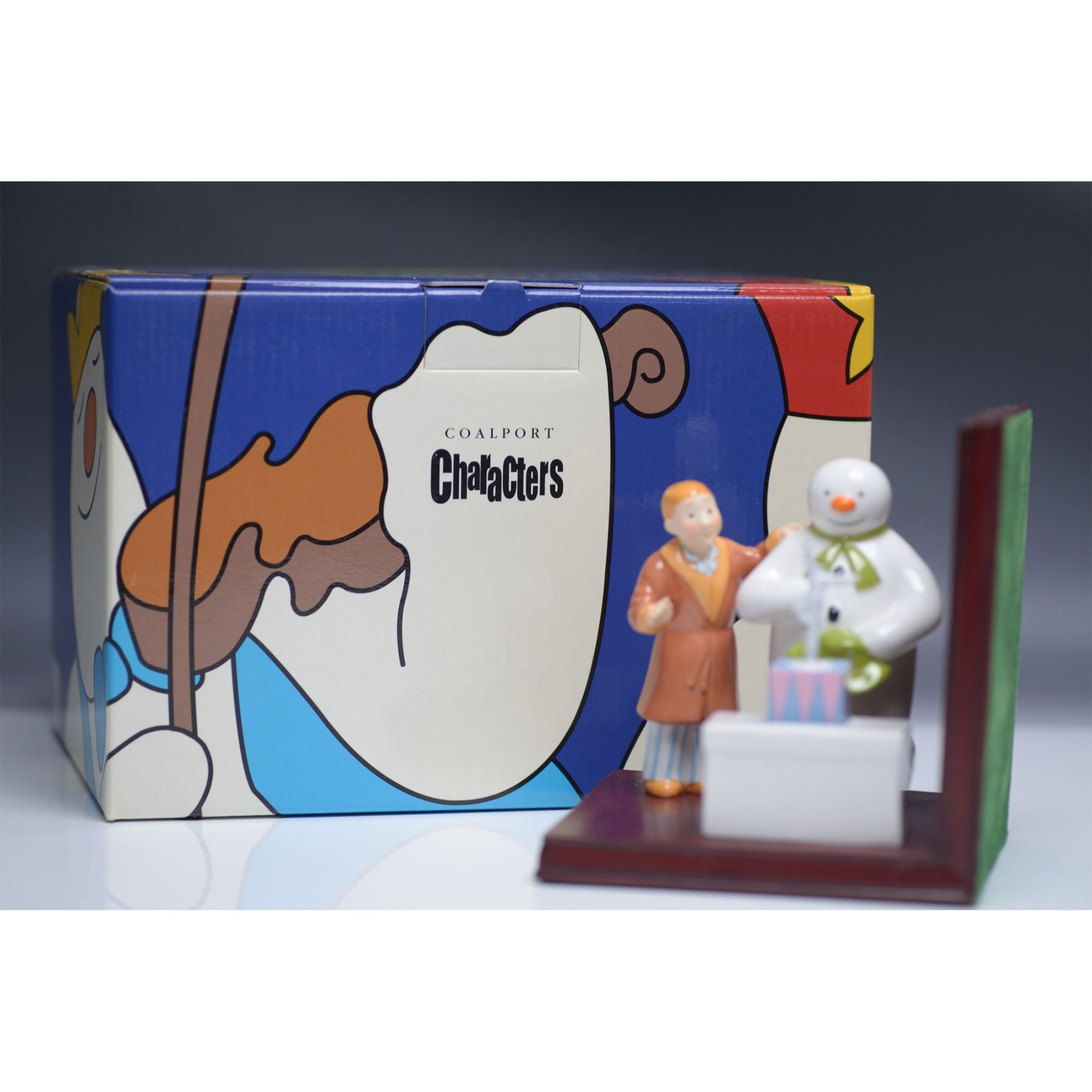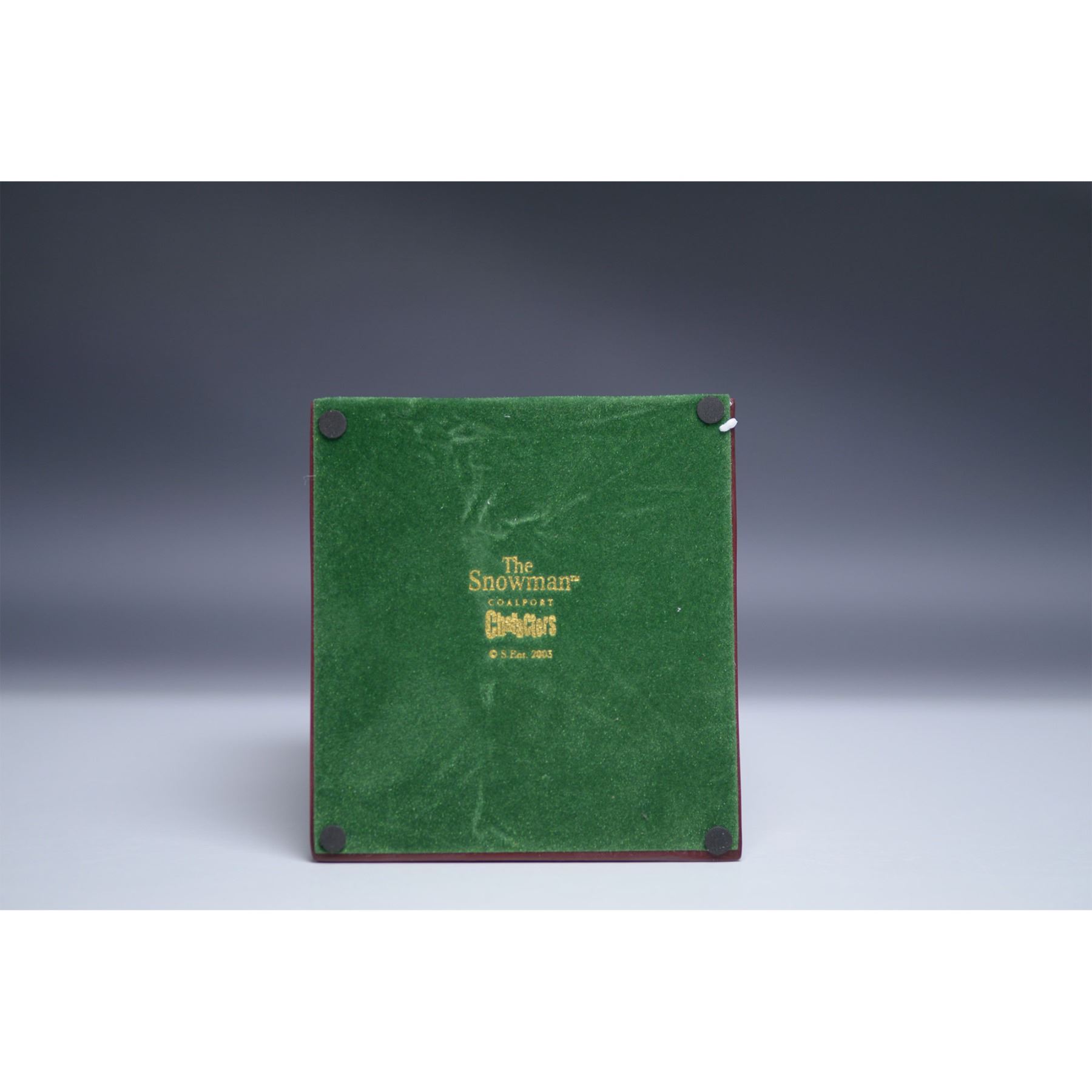 This charming porcelain bookend from Coalport's 2003 The Snowman series features the iconic Snowman and James, capturing a scene from the beloved story. The piece is hand-painted with vibrant colors and is mounted on a wooden base. The base is stamped with The Snowman, Coalport Characters, © S. Est. 2003, confirming its authenticity. This collectible comes with its original, colorful Coalport box.