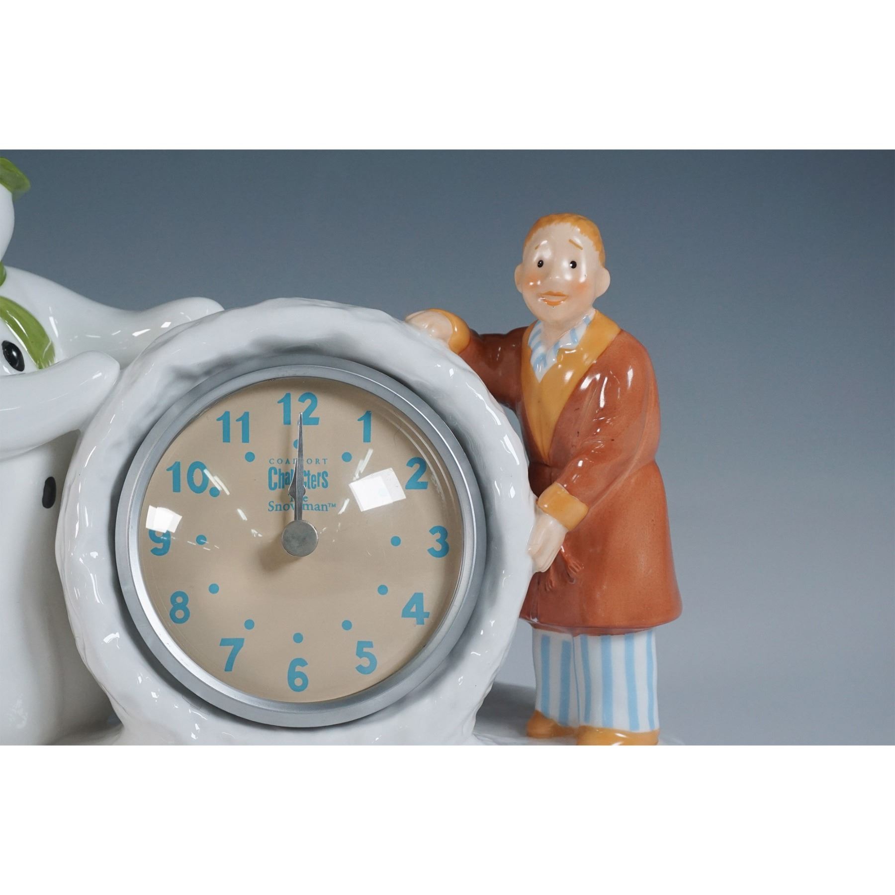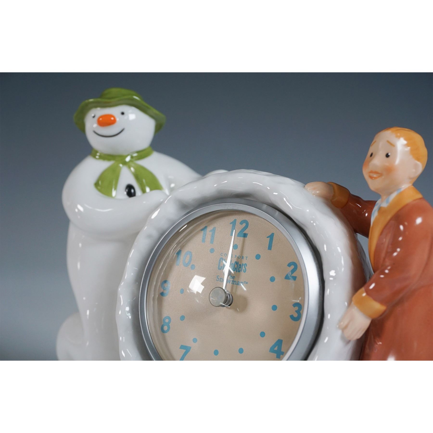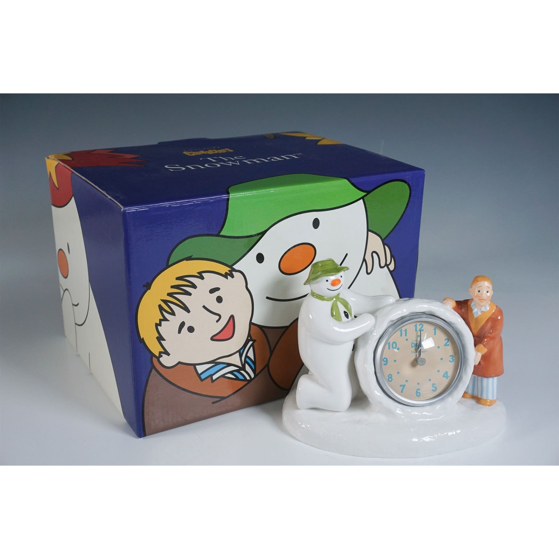 Coalport The Snowman Characters bone china clock, based on Raymond Briggs classic Christmas tale. This charming figurine clock features The Snowman and James rolling a snowball, with a functioning clock at the center. The clock face displays blue numerals and hands, marked Coalport Characters The Snowman. The underside bears the Coalport backstamp, with a copyright date of 2003. Includes the original illustrated box. Measures 6.75"L x 4.5"H. Box measures 10"L x 7"W x 8"H.