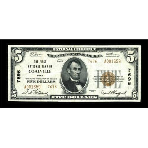 <B>Coalville, UT</B></I> - $5 1929 Ty. 2 <B>The First NB</B></I> Ch. # 7696<BR> A high end example from this community's only bank. Bright <B>Very Fine.</B></I><BR><BR><b>Shipping:</b> Coins & Currency (<a target="_blank" href="http://www.heritageauctions.com/common/shipping.php">view shipping information</a>)