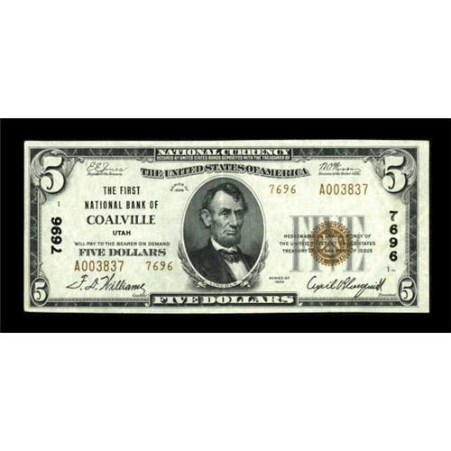 <B>Coalville, UT</B></I> - $5 1929 Ty. 2 <B>The First NB</B></I> Ch. # 7696<BR> A high end example from this community's only bank. Bright <B>Extremely Fine-About Uncirculated</B></I> with plenty of crispness and embossing..<BR><BR><b>Shipping:</b> Coins & Currency (<a target="_blank" href="http://www.heritageauctions.com/common/shipping.php">view shipping information</a>)