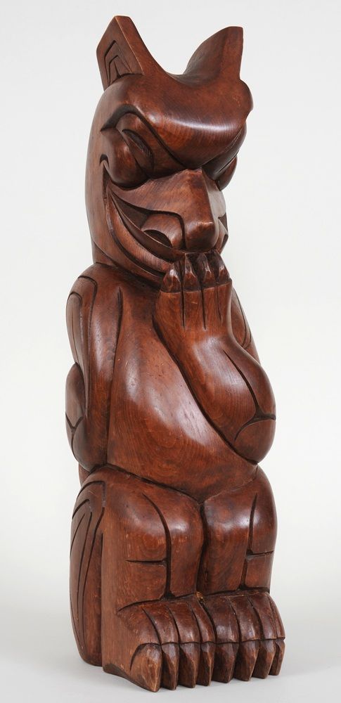 Coast Salish Welcome Bear Holding a Salmon Behind His Back Carved by Doug LaFortune 20" H. Good Condition with Minor Chip On Back