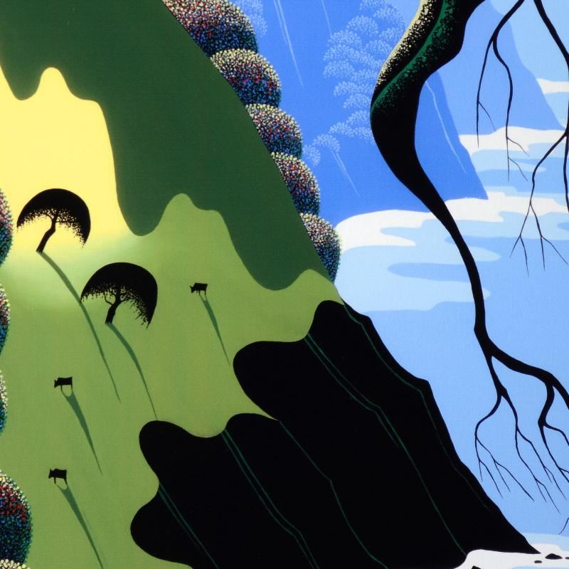 Larissa Holt, a student of distinguished artist Eyvind Earle(1916-2000), uses bold colors and breathtaking scenery to create images of Nature in her own unique style. "Coast and Cows" is a limited edition giclee on stretched canvas by Holt, numbered and bearing Holt's authorized signature. This piece comes gallery wrapped with a black border, and is ready to hang. Includes Certificate of Authenticity! Measures approx. 22" x 27" x 1.5" (image).