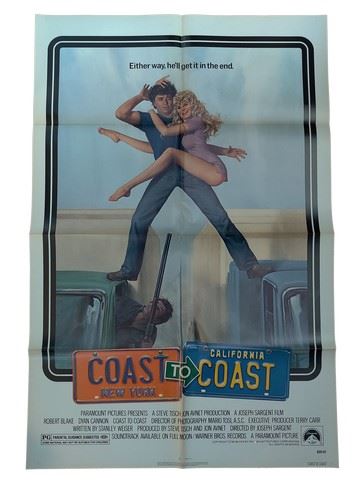Coast to Coast (Paramount Pictures, 1980) poster, U.S. one-sheet. Comedy, Drama, Romance. Starring Dyan Cannon, Robert Blake, Quinn K. Redeker, Michael Lerner, Maxine Stuart, William Lucking, Ellen Gerstein, Patricia Conklin, David Moody, Rozelle Gayle, Martin Beck, Karen Rushmore, Mae Williams, George P. Wilbur, Tom Pletts, Henry Wills, Hap Lawrence, Tom J. Delaney, Darwin Joston. Directed by Joseph Sargent. Creases, some paper loss. Very Fine. (27"x41").