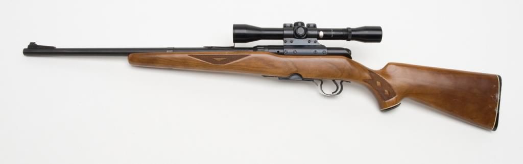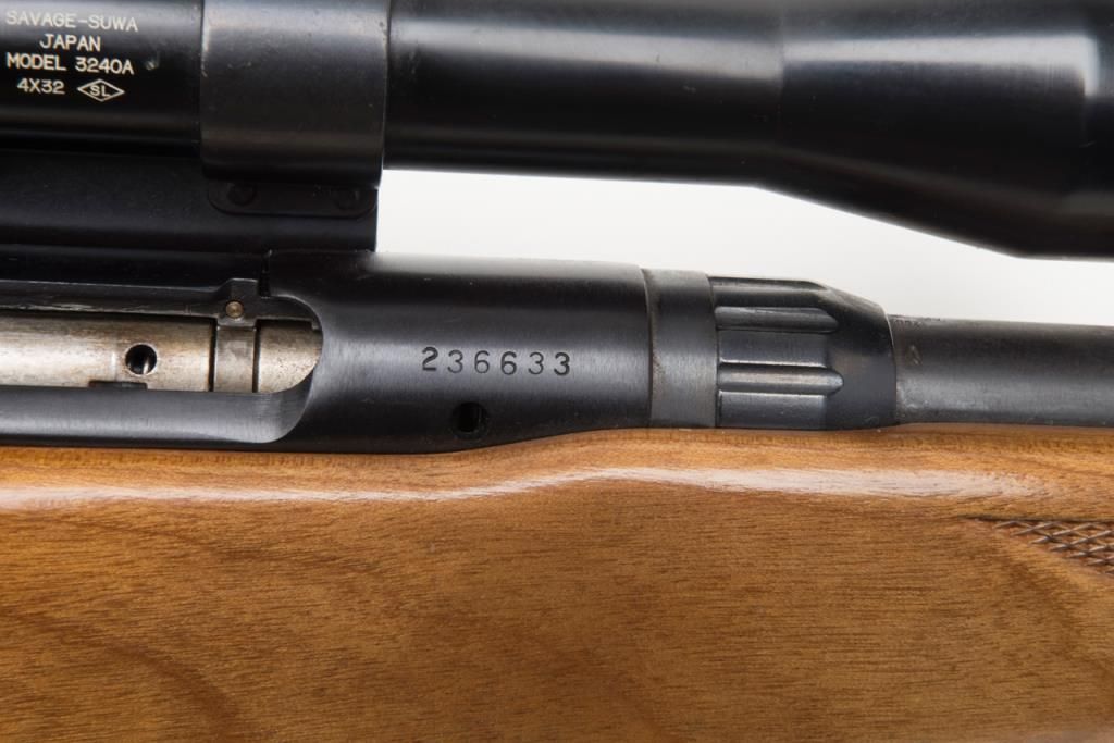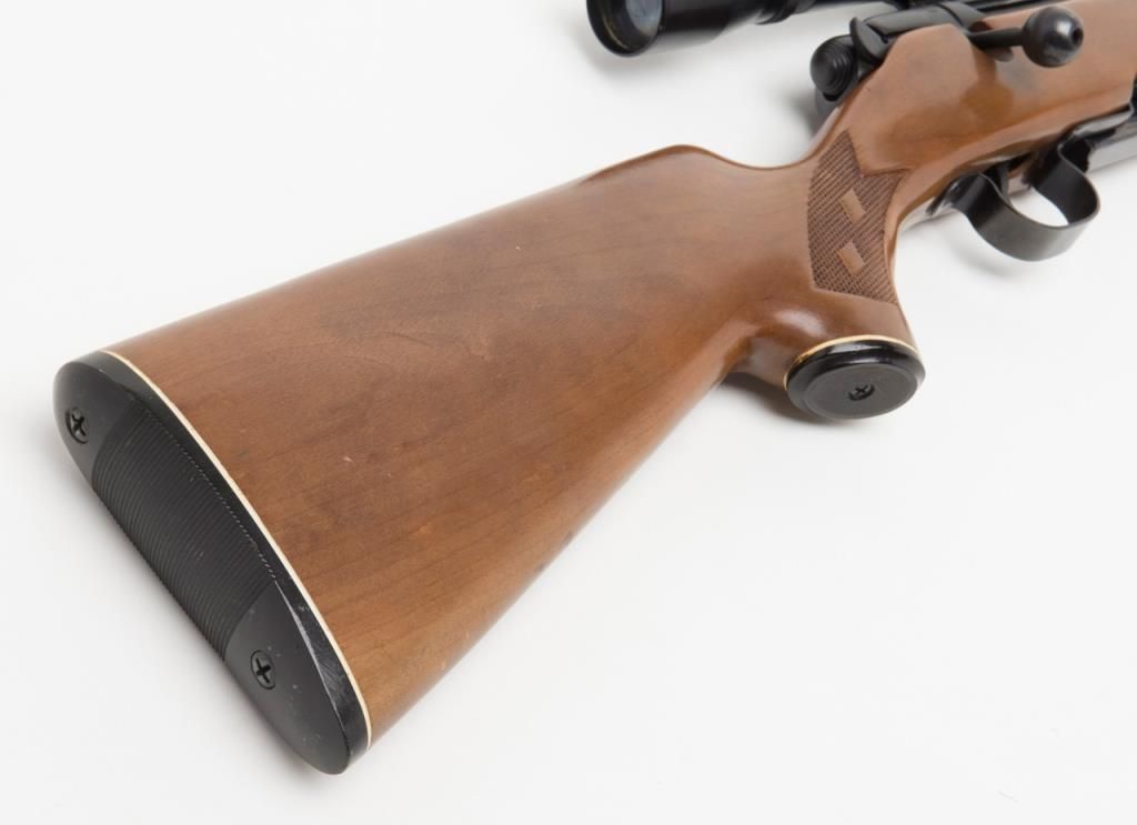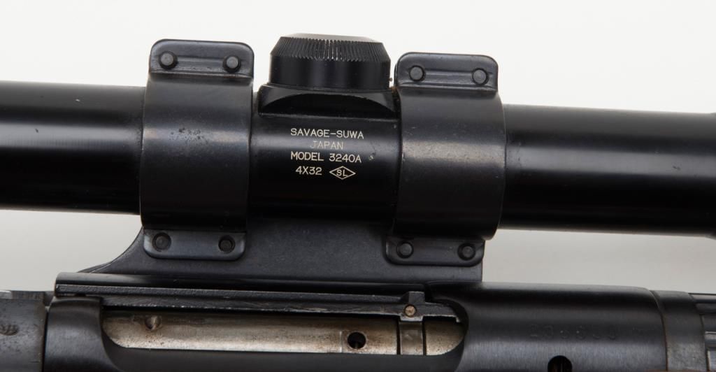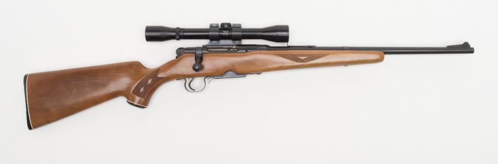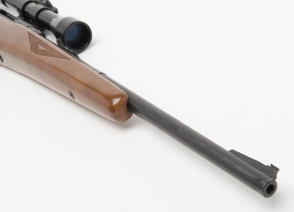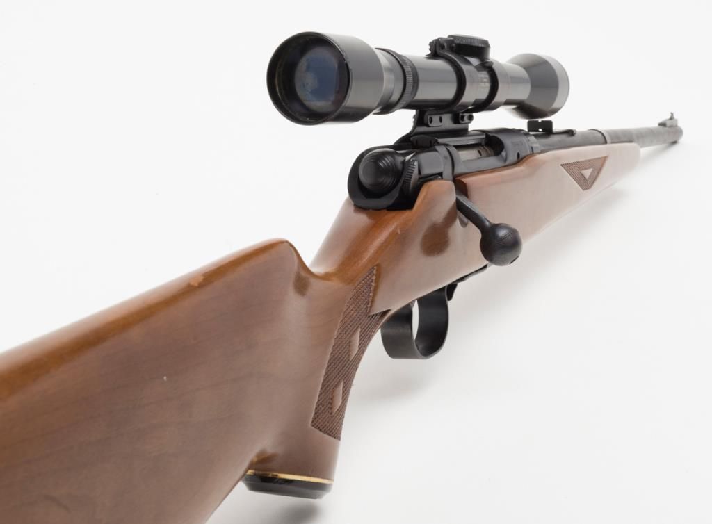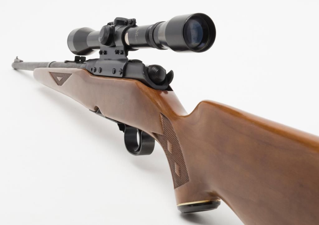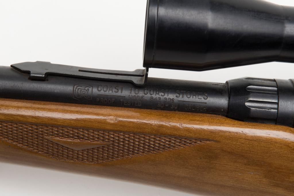 Coast to Coast Stores Model 843, bolt action rifle, cal. 30-30, Serial #236633. The rifle is in overall good to very good condition with a 20” blued barrel. The rifle retains nearly all of its blued finish while the checkered wood stock is in overall good condition with mars and small paint transfers. The bore is good and may clean the action crisp and markings sharp. The rifle retains the appropriate drop magazine. A side mount with a Springfield 4X scope has been addedas well as a hard rubber butt plate. (Modern/PPT). Est. $125-$250.