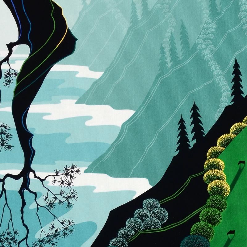 Larissa Holt, a student of distinguished artist Eyvind Earle(1916-2000), uses bold colors and breathtaking scenery to create images of Nature in her own unique style. "Coastal Fir" is a limited edition giclee on stretched canvas by Holt, numbered and bearing Holt's authorized signature. This piece comes gallery wrapped. Includes Certificate of Authenticity! Measures approx. 10" x 12.5" x 1.5" (image).