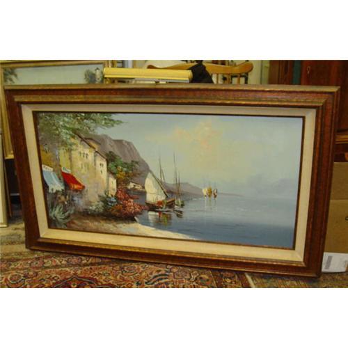 Colorful impressionist "Lisbon Cove" oil painting signed Caldini lower left, measuring 24 x 48 inches and mounted a canvas lined parcel gilt wood frame with over hang lamp, measuring 34 x 58 inches. This painting would make a fantastic addition to any fine household or collection. ****NOTE: Email for larger images.