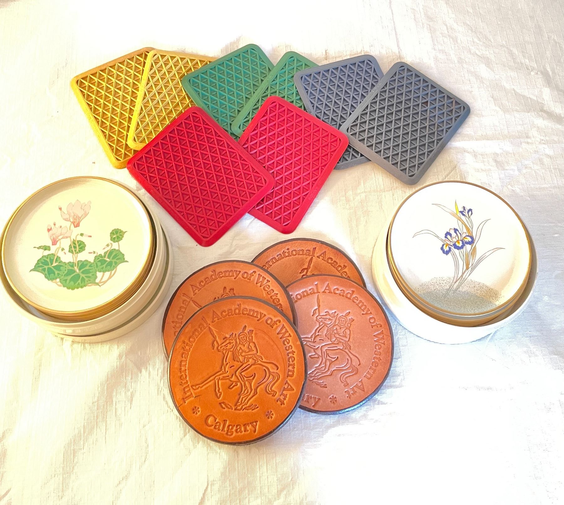 Includes 8 Rubbermaid coasters - 4 International Academy of Western Art Calgary coasters and 12 plastic coasters with containers