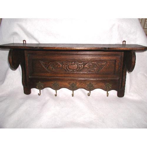 Unique smaller French C.1875 wooden carved coat and hat rack has scalloped shelf above for display items. Thick corbel sides offer decorative accent from the side view. Beautiful center hand carving with 5 bronze sturdy hooks below showing pairs of cherubs on each. Hangs with aid of two heavy brass hangers seen on each end of the top. Excellent condition. Measures 33.5L X 9D X 16.5H.