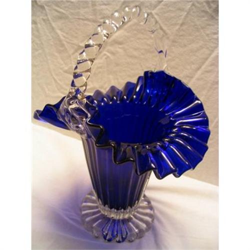 Cobalt Blue Glass Basket with clear glass applied handle. Handle has the appearance of a woven rope with braids. Nicely ruffled basket with no visible defects. Excellent shine. Checks, Money Orders, and Credit Cards (via paypal) gladly accepted.