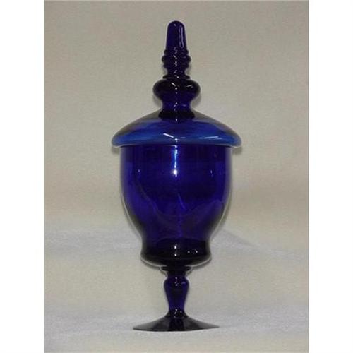 12'' tall by 5'' diameter covered cobalt glass dish. Pedestal base, unmarked. Tiny flake inside of rim. Lovely color.