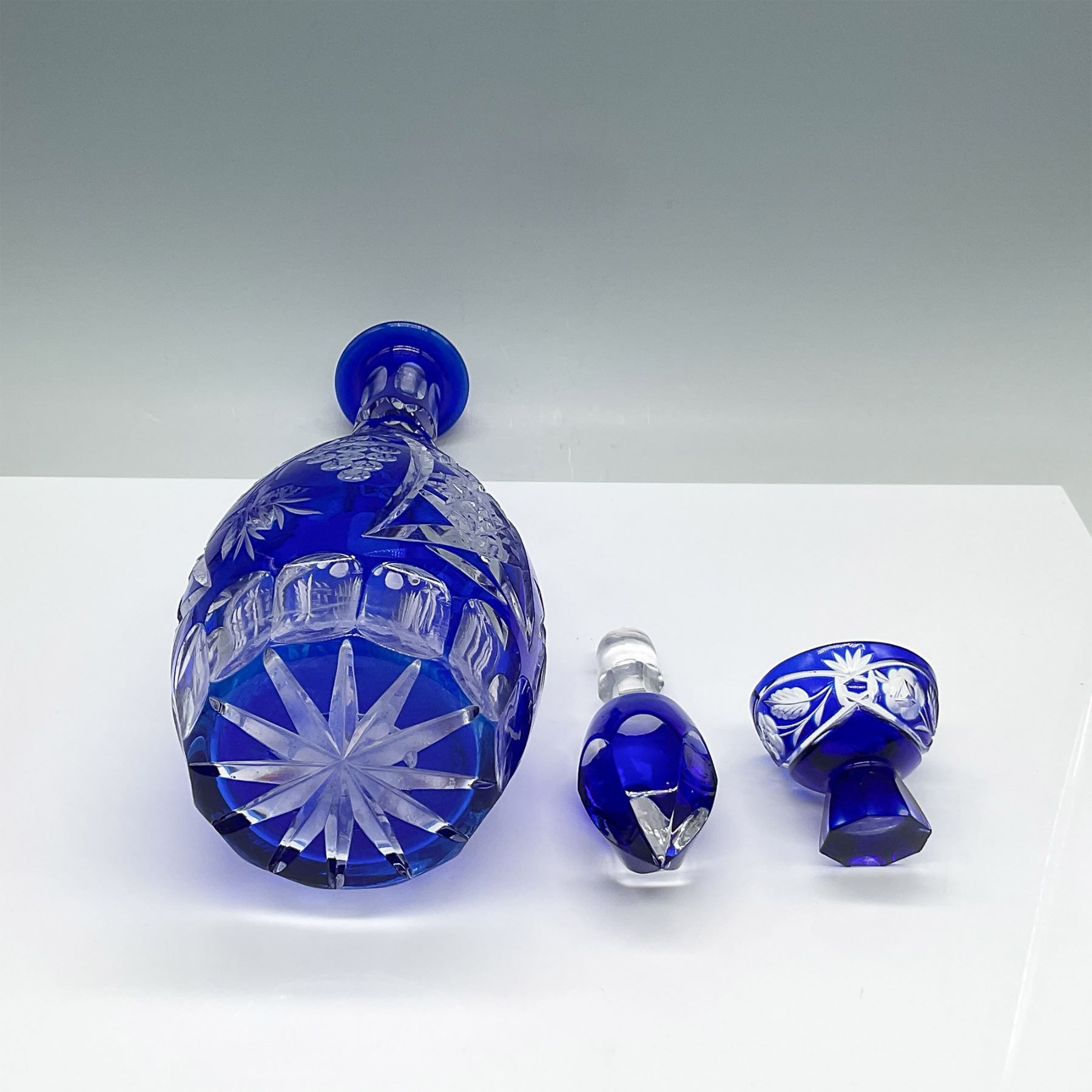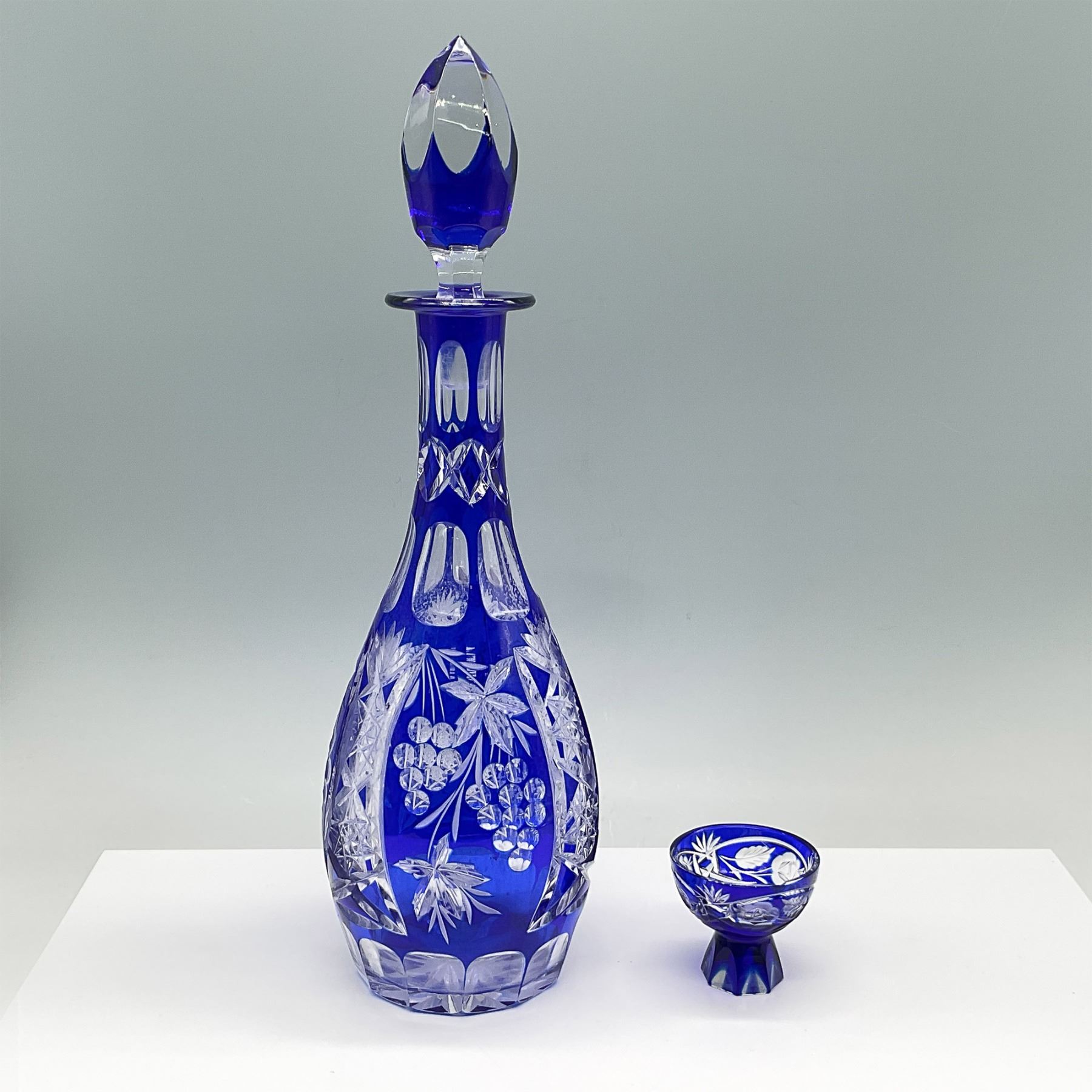 Elegant cobalt blue cut-to-clear crystal decanter with a matching stopper and intricate floral and geometric patterns. The decanter is accompanied by a coordinating cordial glass, both showcasing stunning craftsmanship with clear starburst accents. This striking duo adds timeless sophistication to any collection or display.