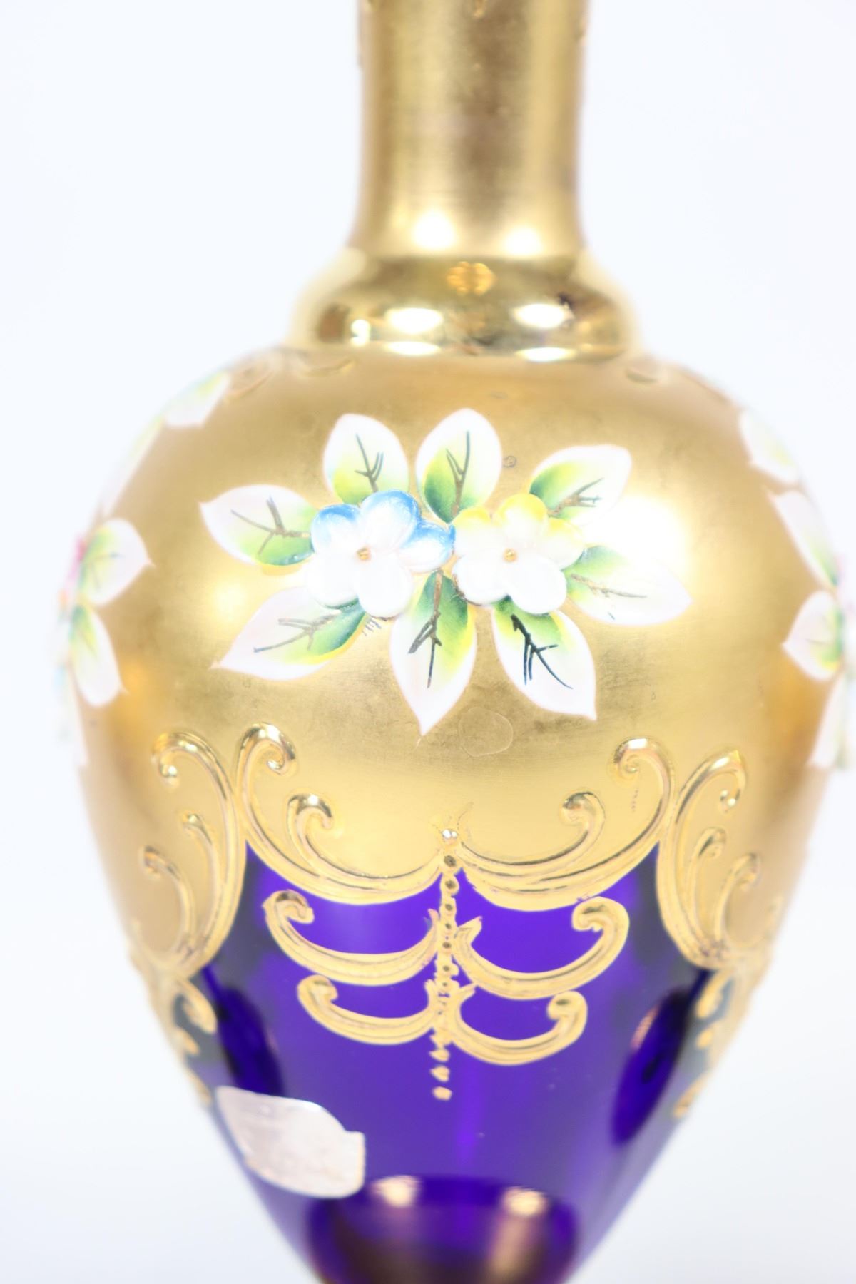 Bohemian glass decanter with 4 cordials, gilt decoration and enameled flowers.