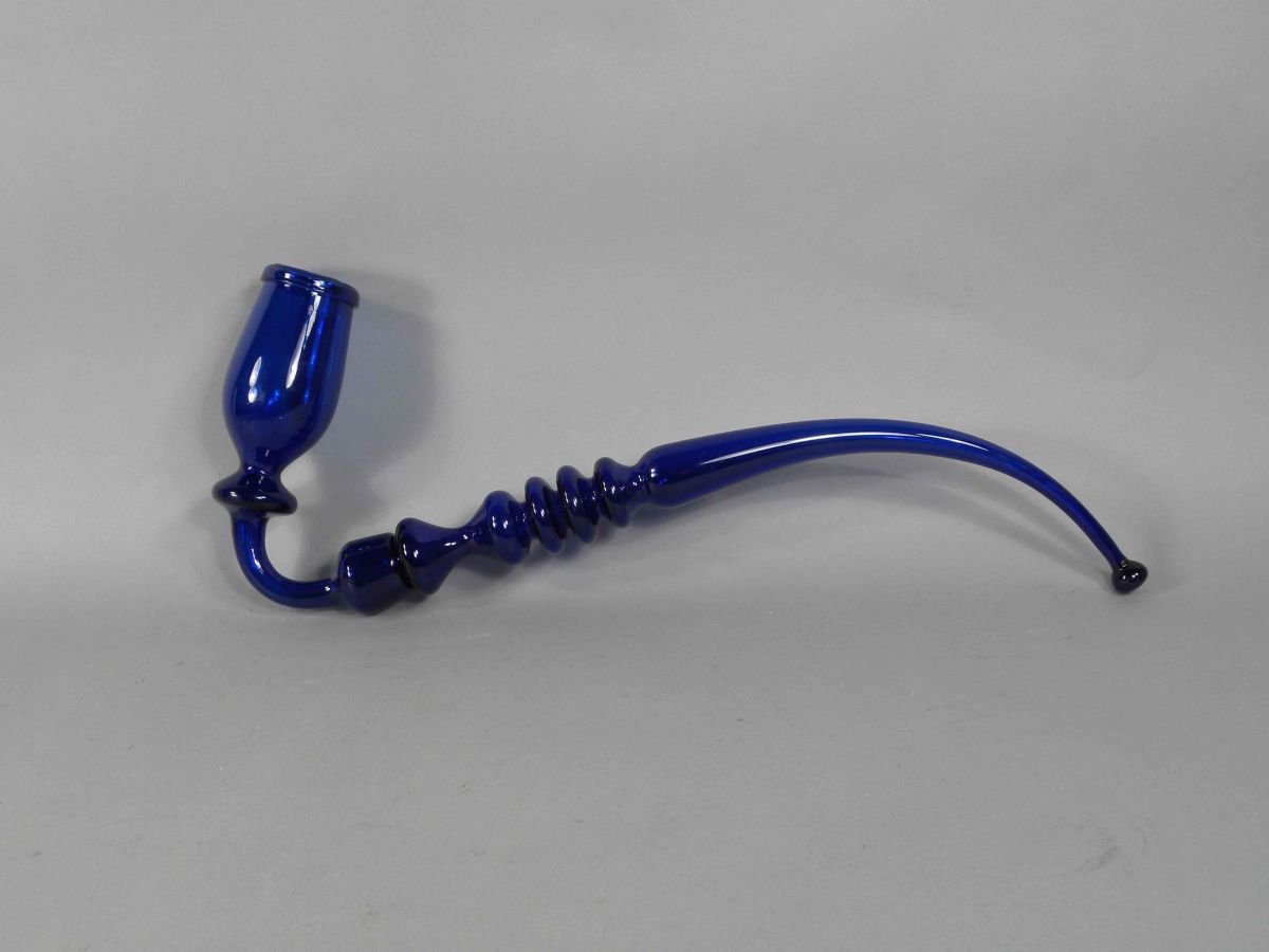 Cobalt Blue Glass Pipe. Some small chips around rim of bowl otherwise excellent condition. 20 inches long.