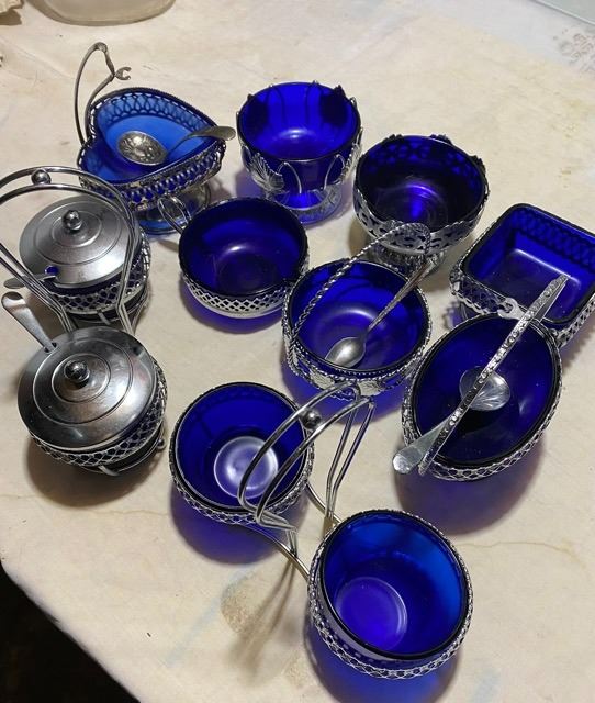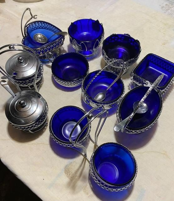 Cobalt Blue Glassware - cream, sugar, pickles, condiments - 11 pieces