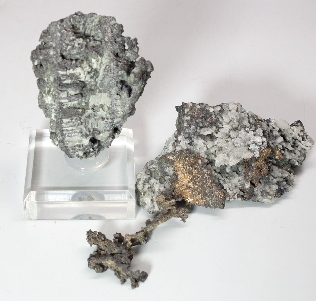 Lot of 3: 1.) Attractive Silver Leaf 1.5" tall complex crystal silver leaf with acanthite from the Capital Mine measures 1.5" x 1" x .5" 2.) 2.25" tall Safflorite pseudomorph after spinell-twin silver crystals with native silver near the core. Measures 2.25 x 1.5 x .75" 3.) 2.75" Wide unusual spoecimen of bright leaf silver on quartz crystals with minor acanthite. Langin Mine Cobalt area Ontario. Measures 2.75 x 1.75 x .75" - HKA#65133