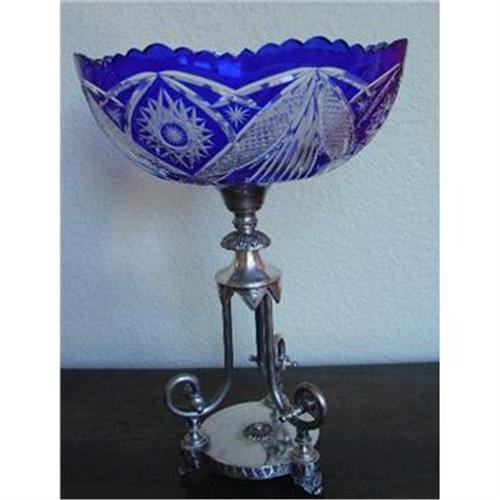 Atop a Victorian scrolled silver plate base, sits a cobalt cut to clear glass epergne. This piece is permanently attached to the base. The edges are cut and scalloped. There is no markings on the bottom of the base. <p> Age: Late 19th to early 20th Century <p> Measurements: Approximately 13 1/2" in Height, 9 1/2" in width <p> Condition: No chips or nicks; excellent antique condition