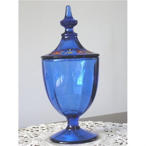 Beautiful Cobalt Glass Compote. The lid is hand decorated with a floral design. Circa 1910.