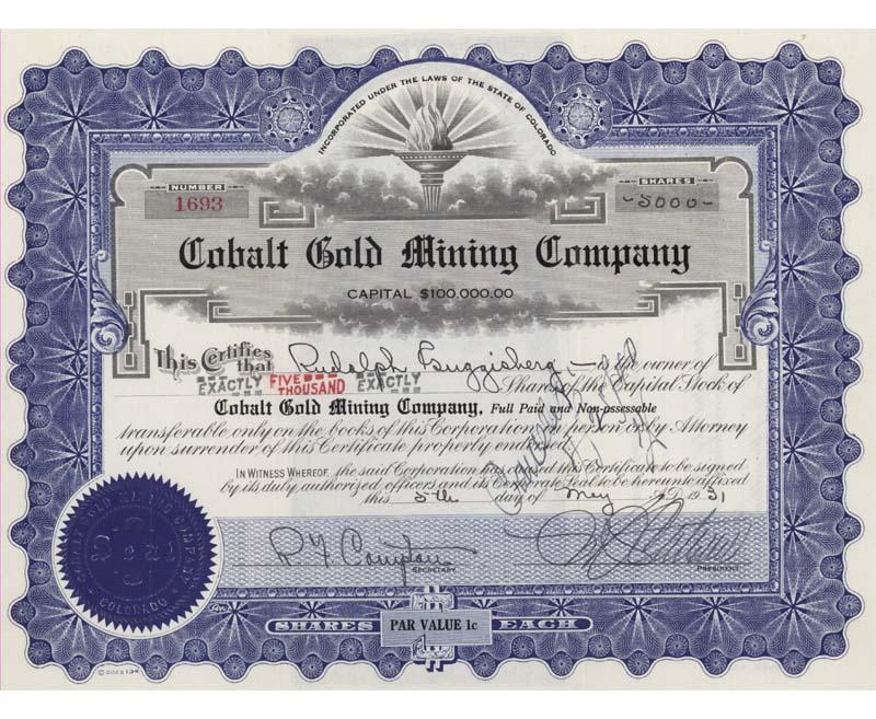 1931, Colorado. Stock certificate for 5000 shares. Blue/Black. Vignette at top center of a flame in torch. Pen cancelled and fine.