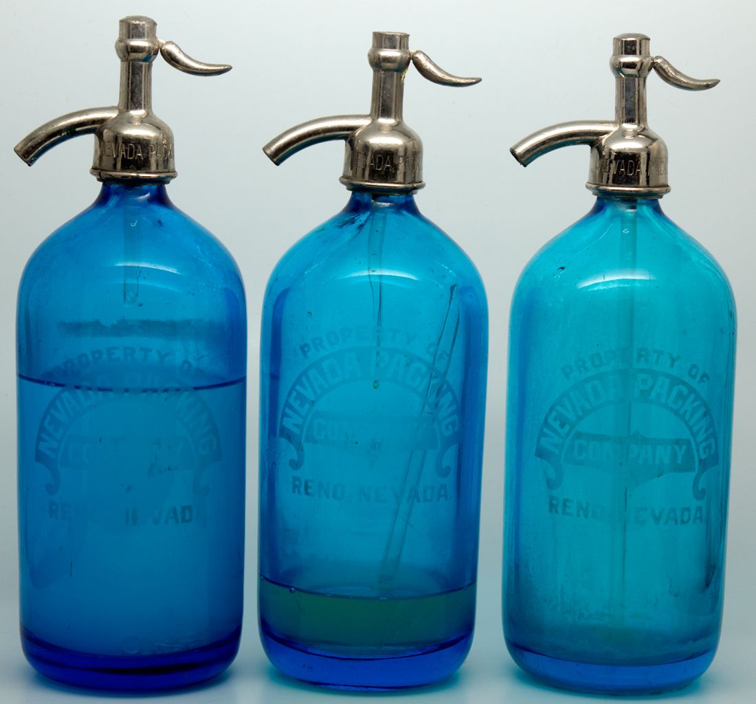 These cobalt seltzers are gorgeous: light cobalt, deep blue, and a rare cornflower color. Each is 12” tall, with matching chrome tops, and etched “PROPERTY OF/ NEVADA PACKING/ COMPANY/ RENO, NEVADA.” on front. Bottoms marked “MADE/ IN/ CZECHO-SLOVAKIA”. No chips or cracks. The two darker bottles still contain liquid, and their siphon tubes are broken. The very top of the deep blue seltzer’s metal top is missing. -60179