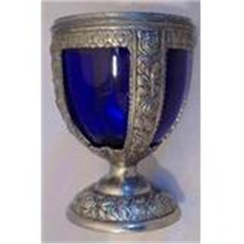 Unique cobalt and silver plate goblet. The cobalt glass can be separated from decorative silver plate. Measures 4.5" tall and 3.25" wide.
