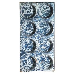 Cobalt blue & white granite ware muffin pan, holds 8 muffins, small edge chips front & back, has hole for hanging, 7"W x 14"H.