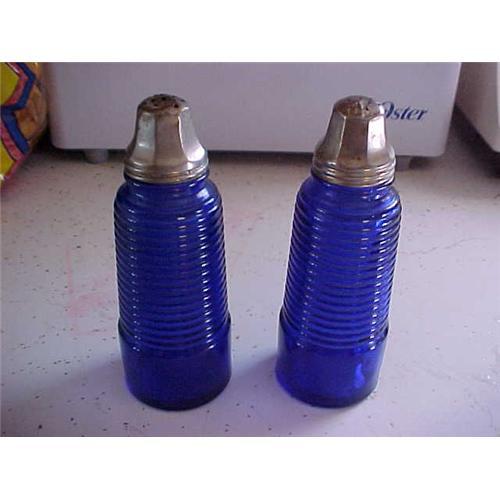 Cobalt Salt & Peppers; 5.5" tall; ; aluminum tops No. 3 and No. 5 on bottoms; (c) depression era