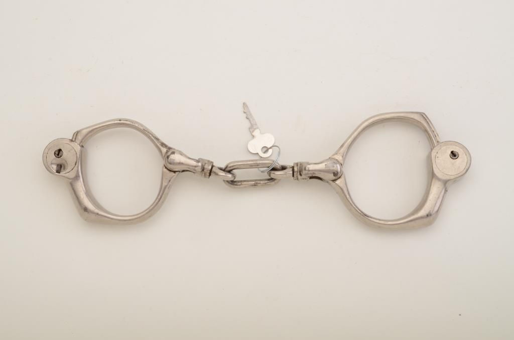 Cobb Detective handcuffs with key, nickel plated in very good condition, swivel single link; working at time of description; circa 1900. From an old collection. Est.: $150-$300.