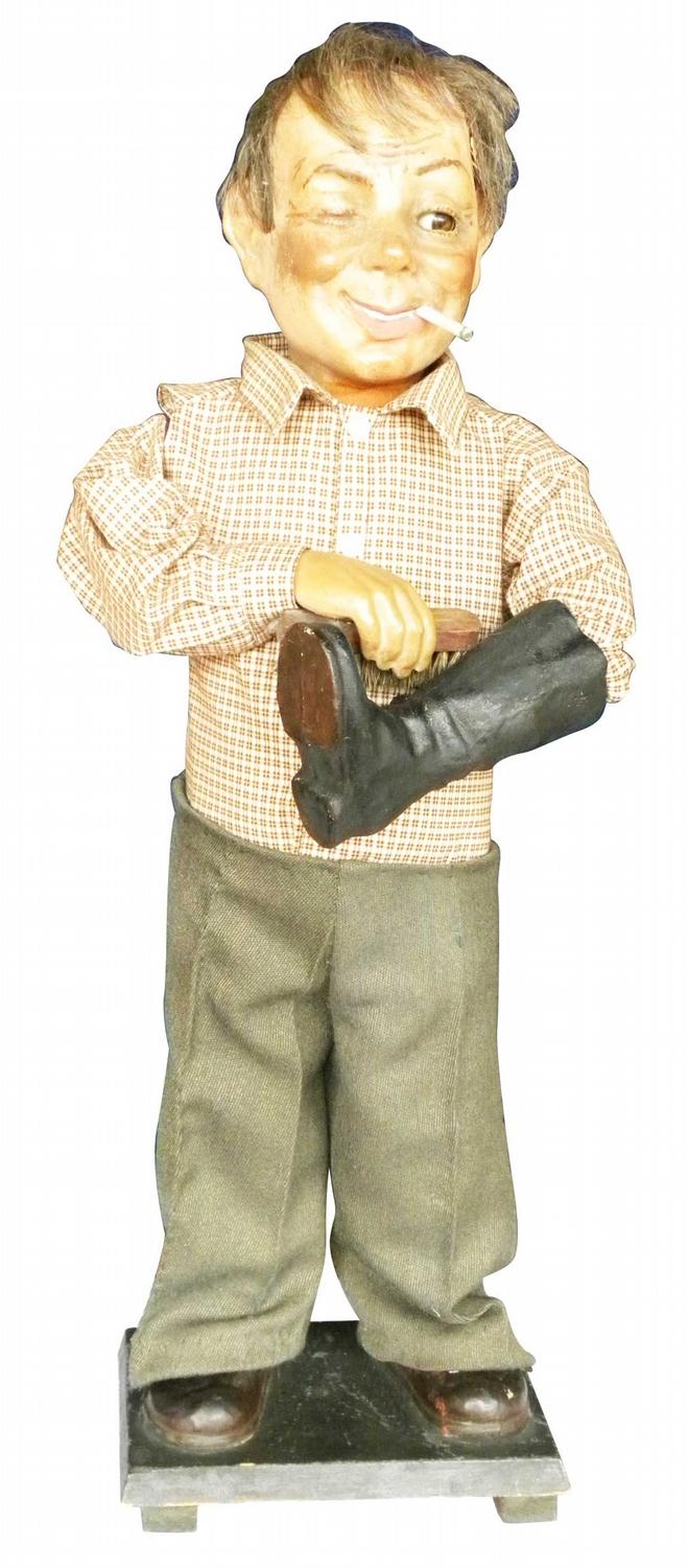 Cobbler Automaton, arm, head and eyes move. Composition head with glass eyes. Very good original condition, comes with key. 22 inches tall.