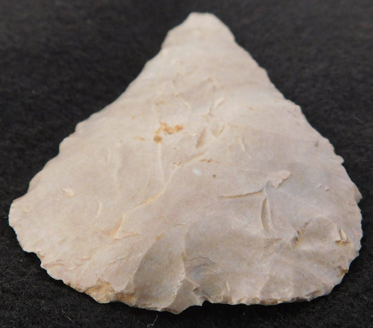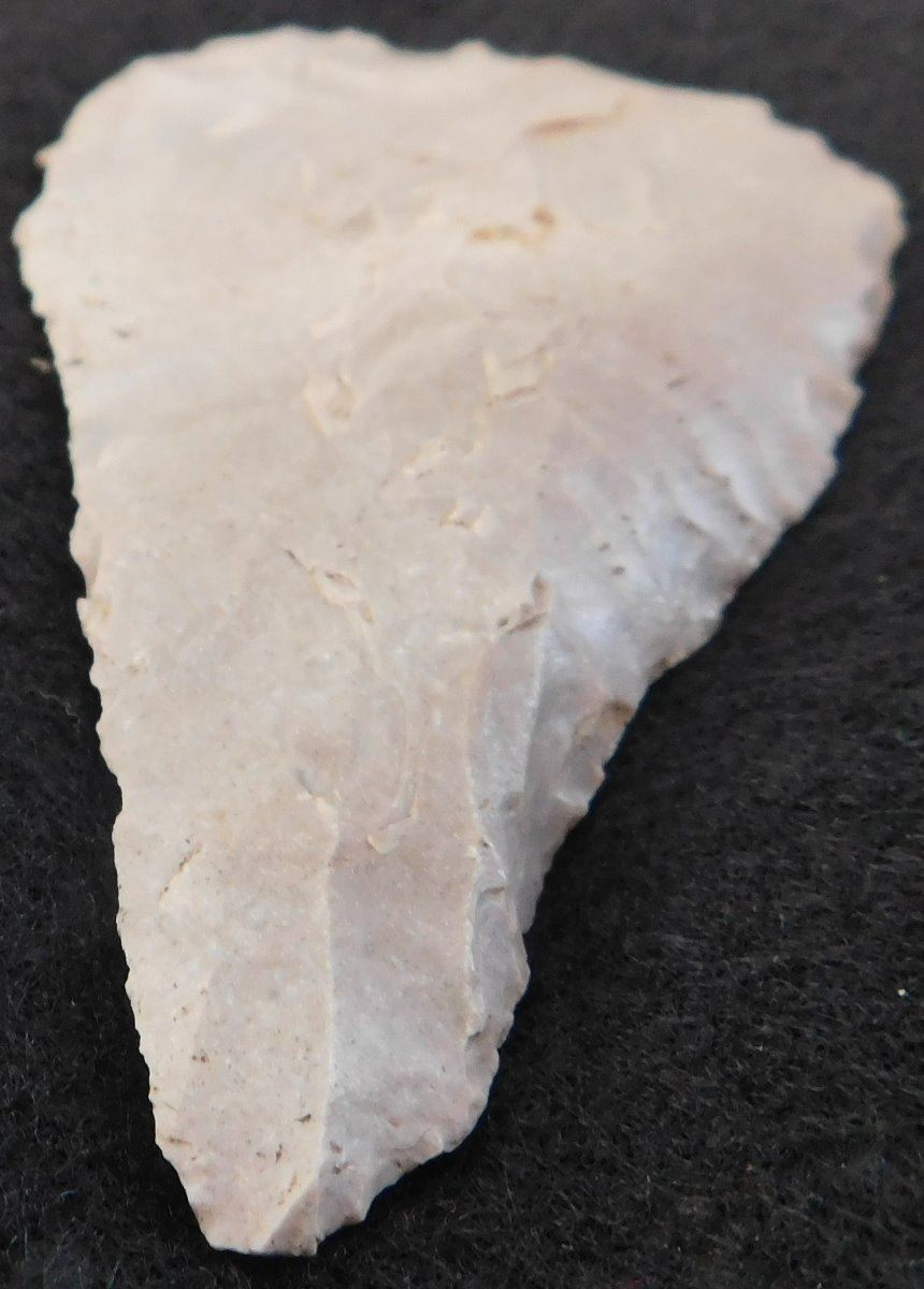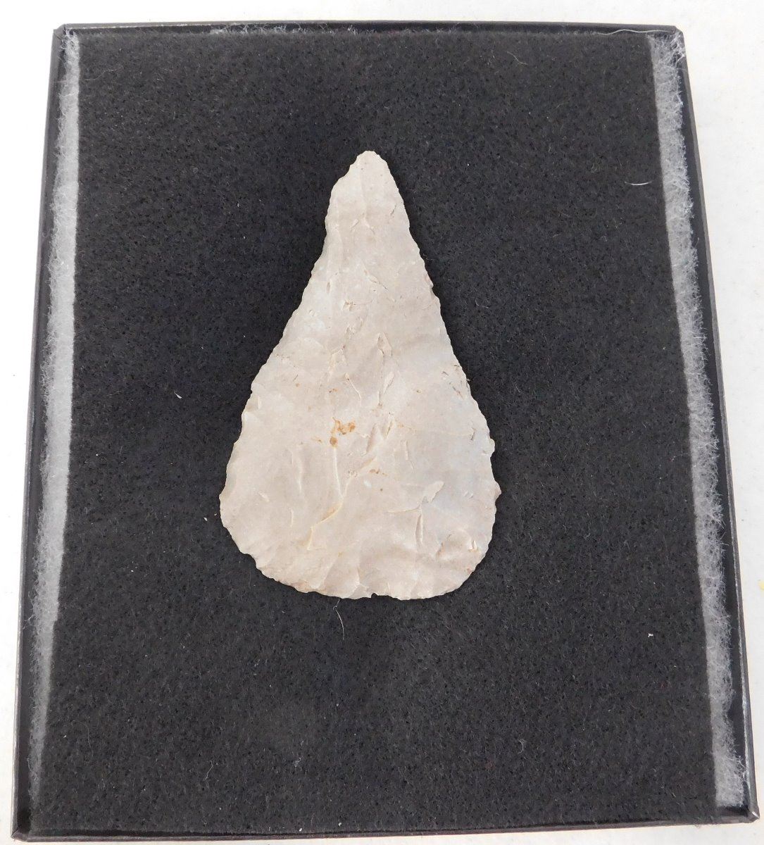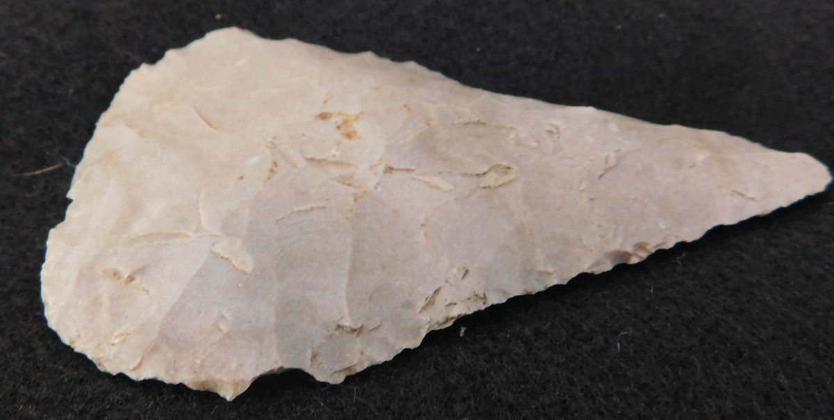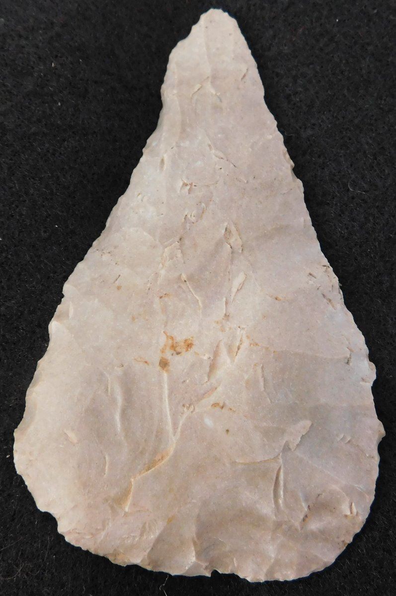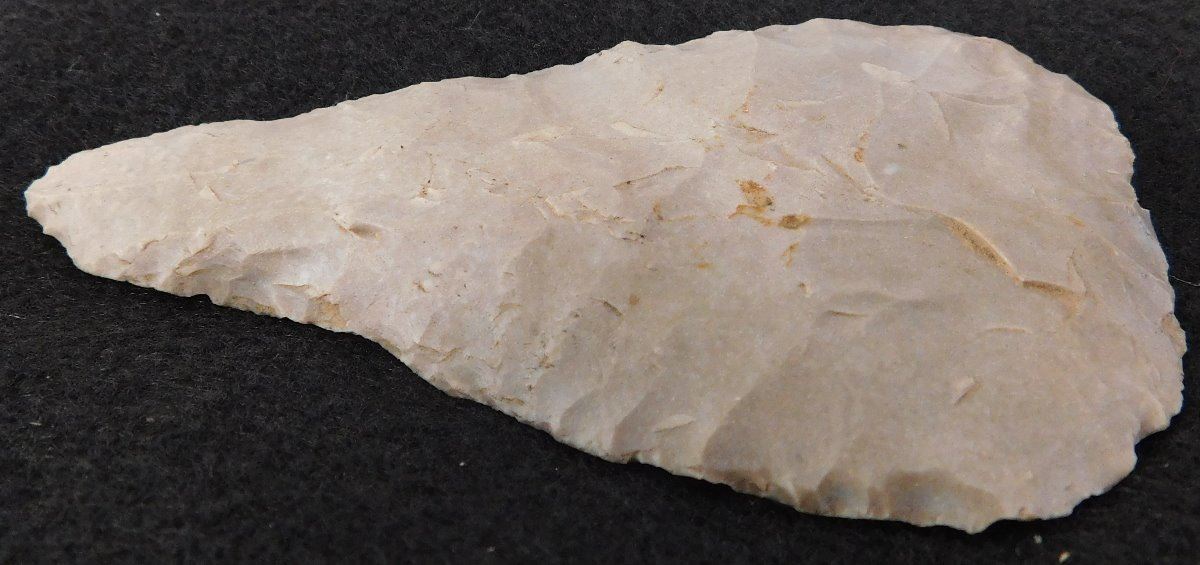 Cobbs Flint Knife, pre-historic item. Made of bluish-grey chert, the item is 3.5" x 2" x 0.25". Kentucky, Jefferson County. Frame not included. Condition: Minor chips, see images. Shipping: $16.50 w/insurance and signature.