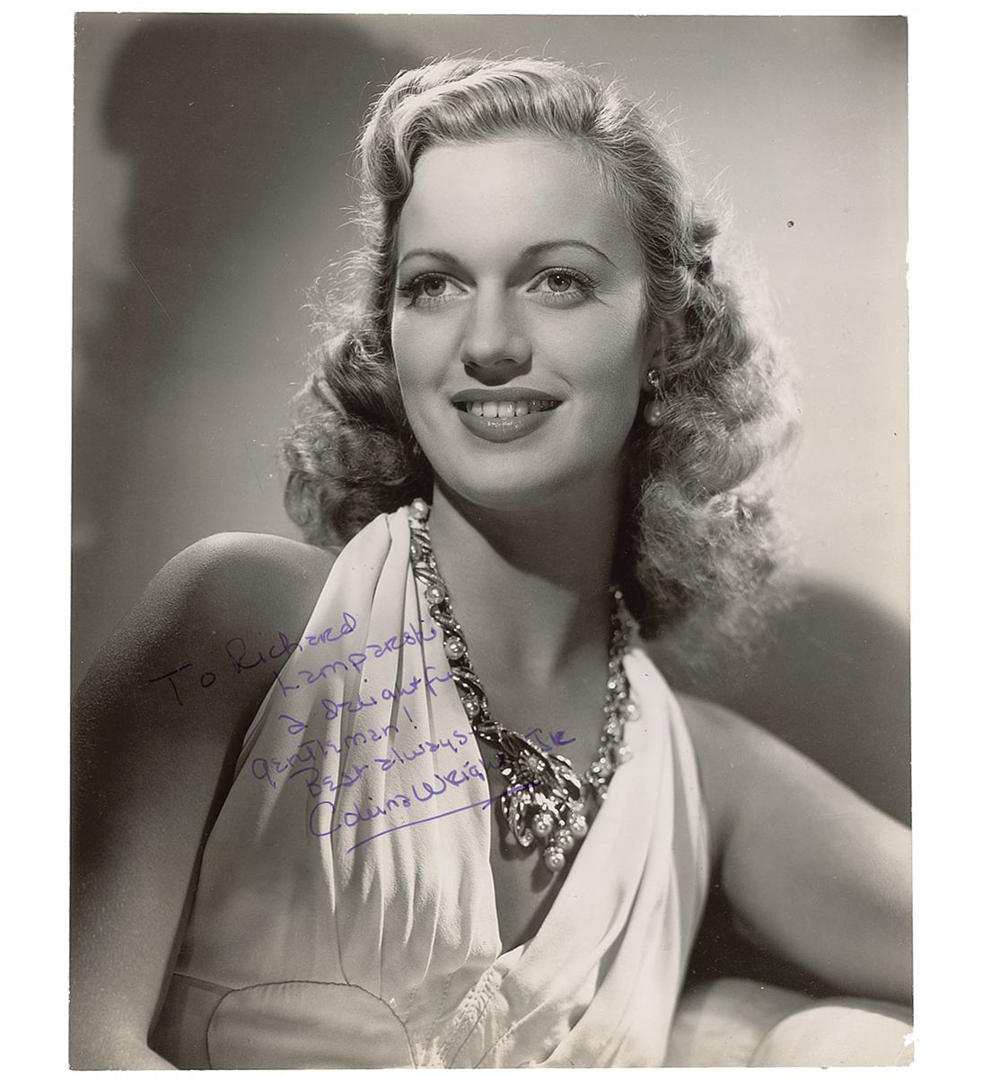 Glamorous glossy 7.25 x 9 photo of Wright in pearls and bare shoulders, signed and inscribed in purple felt tip, “To Richard Lamparski, a delightful gentleman! Best always, Cobina Wright, Jr.” In fine condition, with some mild corner creasing and trimmed edges. Lamparski, host of the 1960s and 1970s radio show entitled, ‘Whatever Became of...” was best known for his wit, sarcasm, and sometimes vulgar interviews with various celebrities.