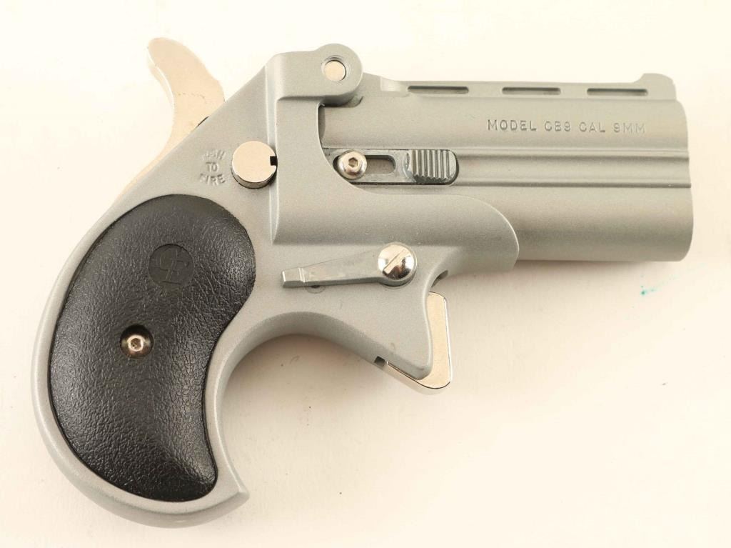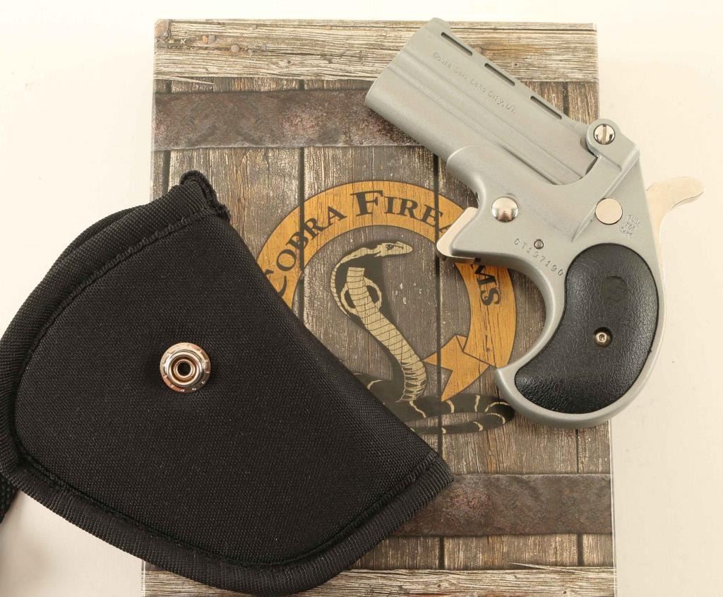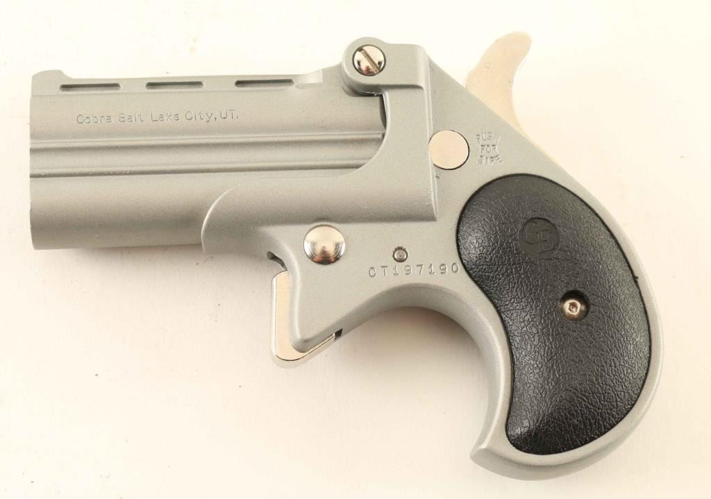 Deringer. Two barreled, tip-up style. 99% Matte-gray finish, with black synthetic grips. Chrome trigger, and hammer. two-cock action is tight, and barrels lock up tight. A couple of very minor scratches to the finish. 2 3/4" barrels. Gun appears in almost new condition, except bore are dirty, but appear very good. Comes in the original Cobra factory box , with the paperwork. Also included is a black nylon holster. NRA condition- Very Good, plus. Modern firearm.