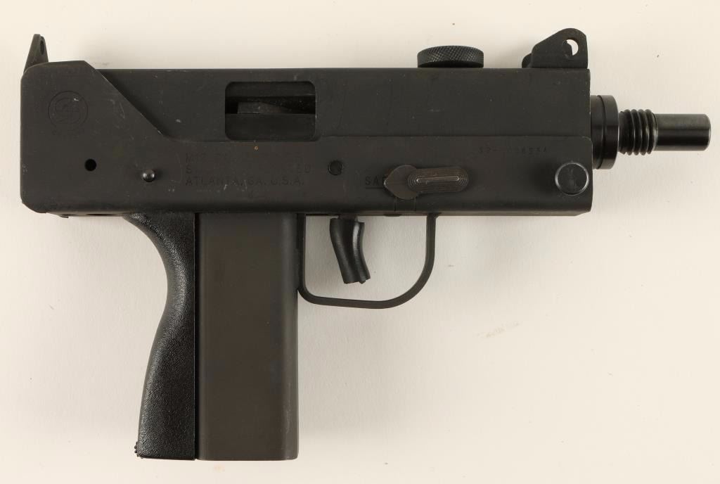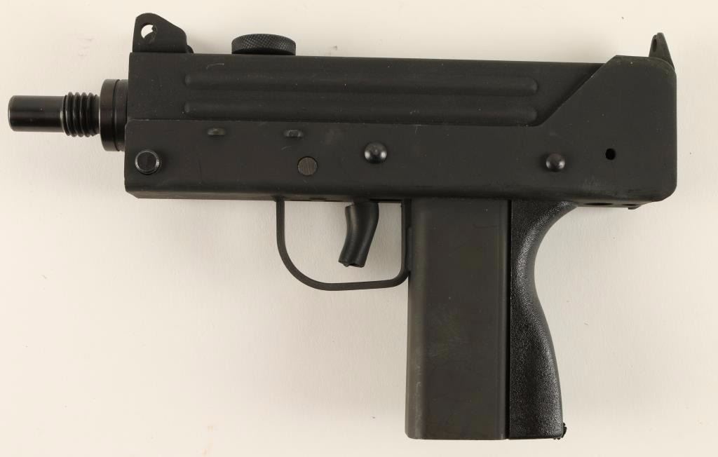 Stamped steel semi automatic pistol chambered in .380 Automatic Colt Pistol. Features a parkerized finish, 5" treaded barrel, fixed sights, safety switch, black synthetic backstrap, round charging handle, and padded trigger. Finish shows moderate handling wear with scratches and rubs. Action is strong and bore is bright with some debris. Condition is very good. ***Modern Firearm***