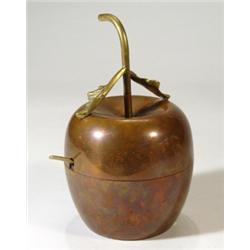 Cobre Arts & Crafts style apple shaped preserve pot and cover with spoon, marks to base, 19cm high