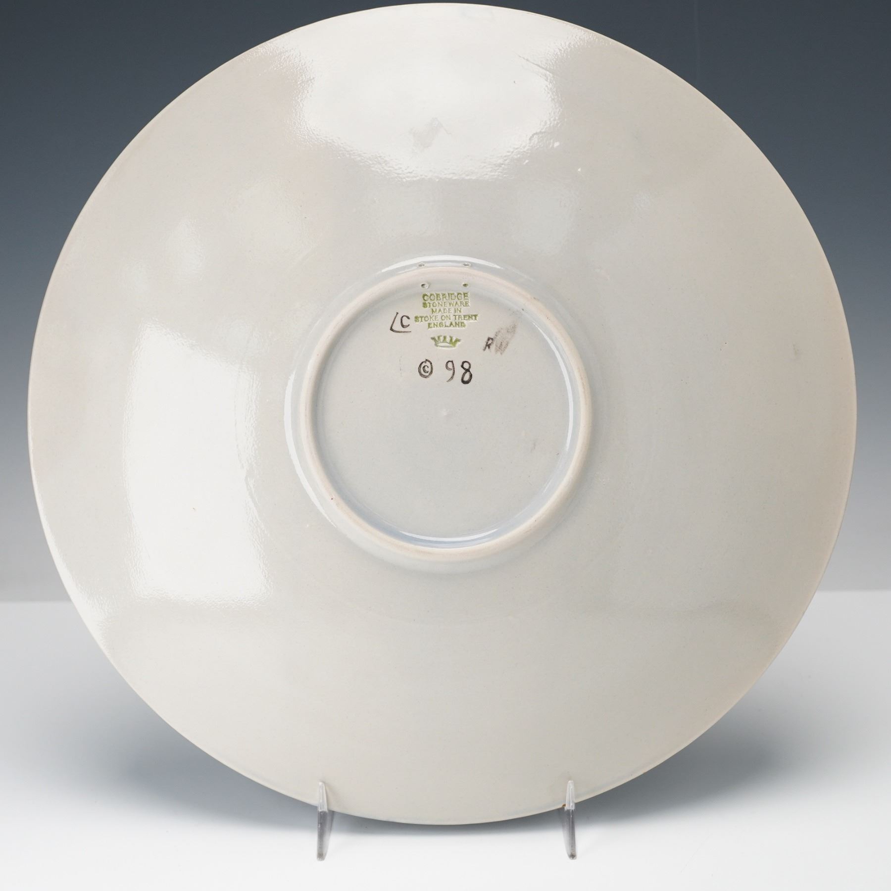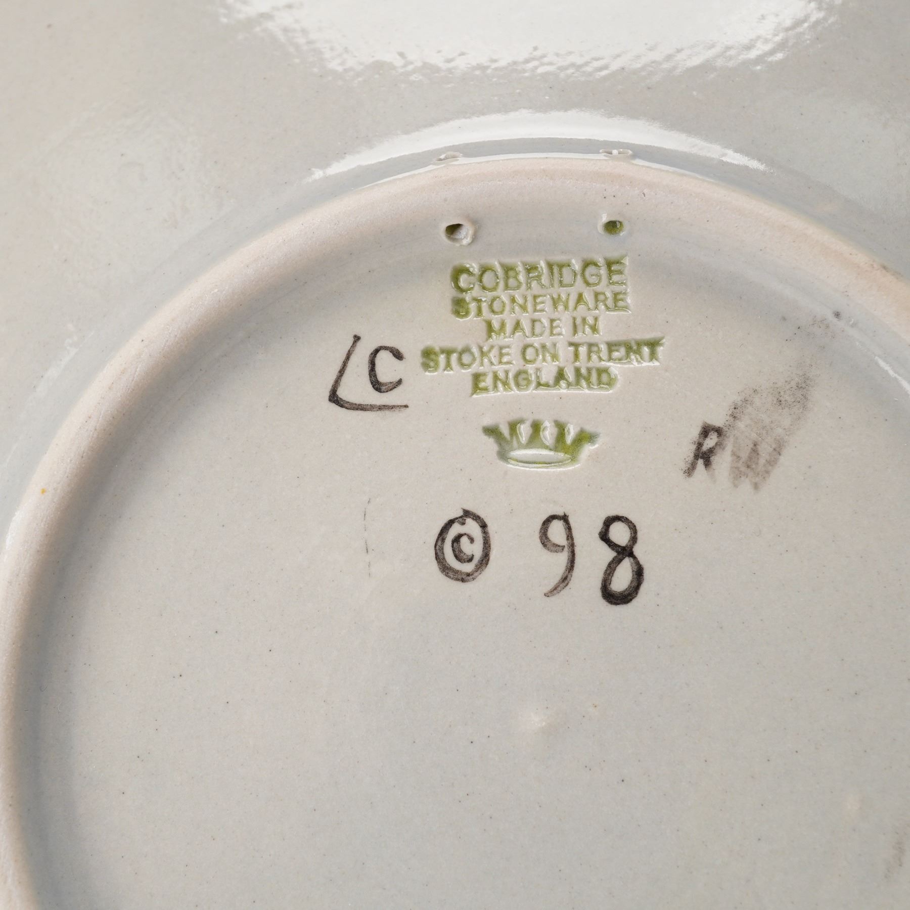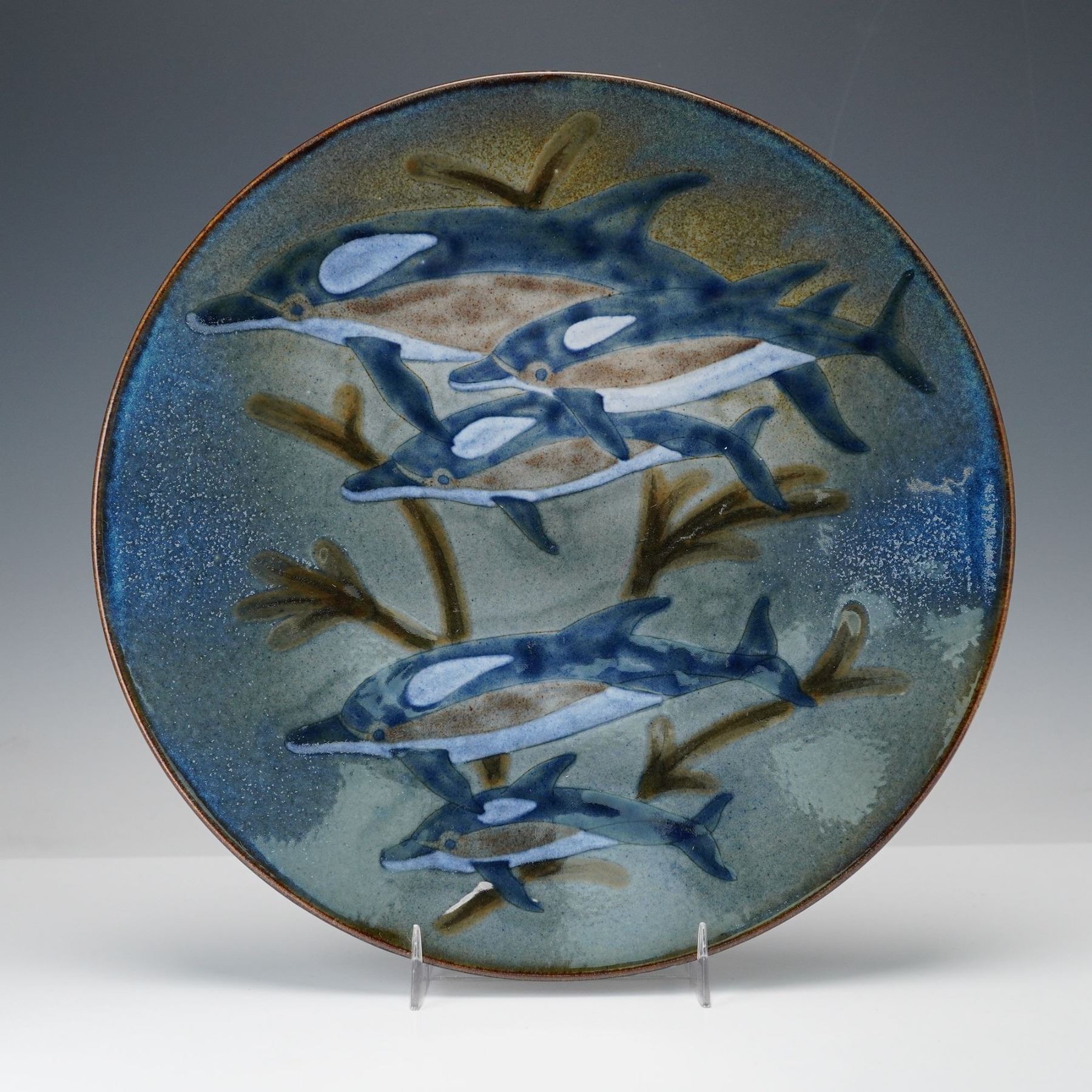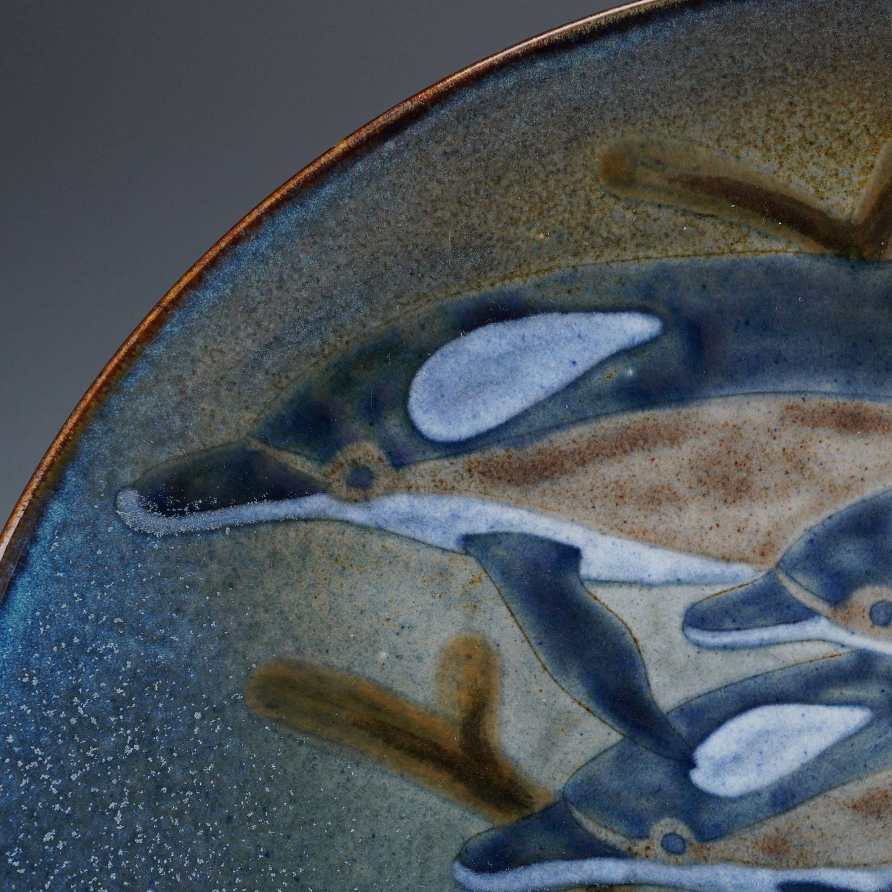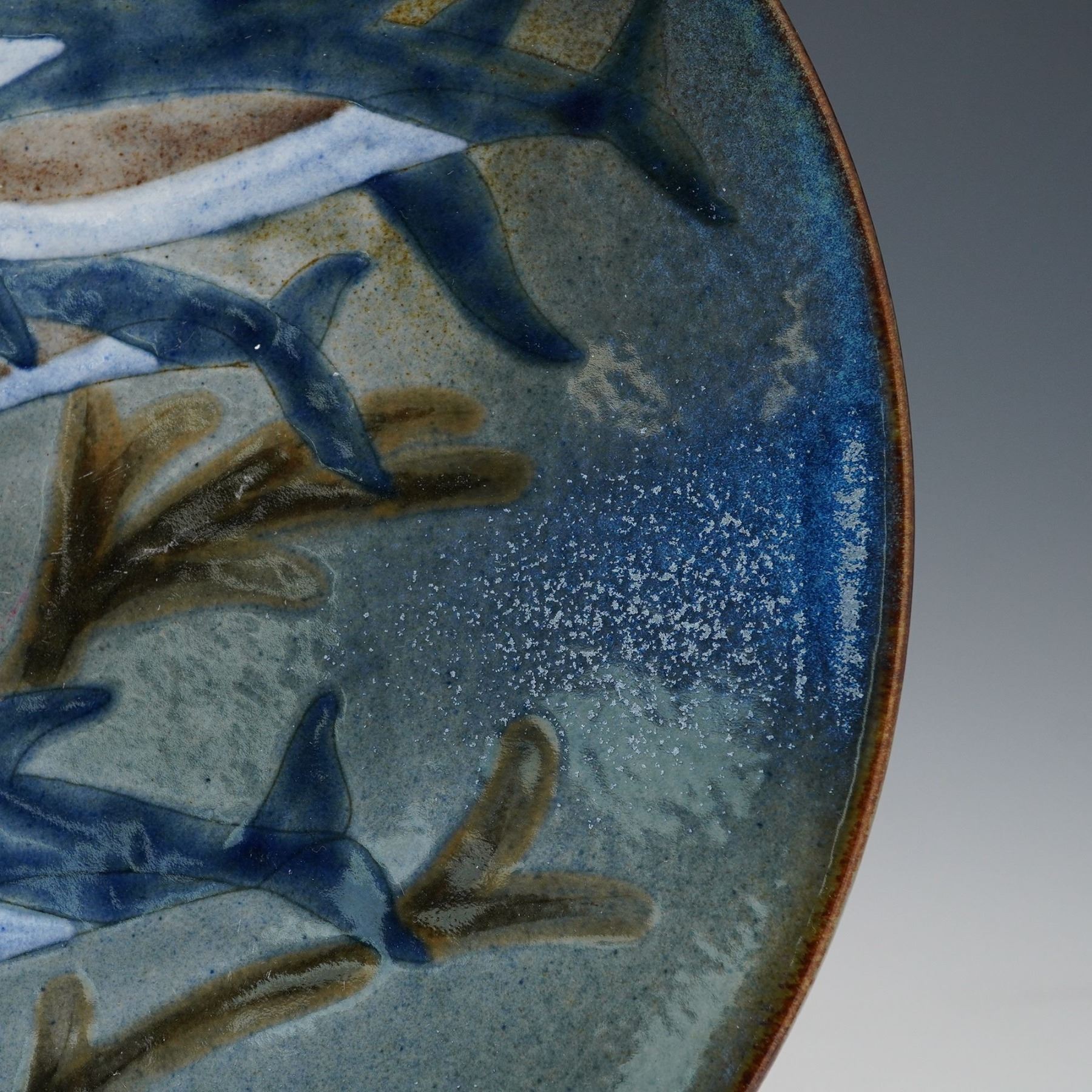A wonderful stoneware charger decorated with a pod of dolphins in layered blue and earth-toned glazes. The aquatic scene is rendered in painterly slip with speckled surface variation and subtle branching coral forms. Marked "RW", "LC", and dated "98" to the underside. Cobridge backstamp.