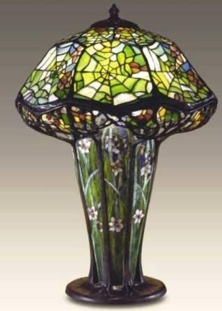 In the style of Tiffany. *Cobweb Shade with Floral Mosaic Base *27"H, 18"W *Shade 18" Diameter *3 x 60W Med Base *Antique Bronze Finish (D0027)