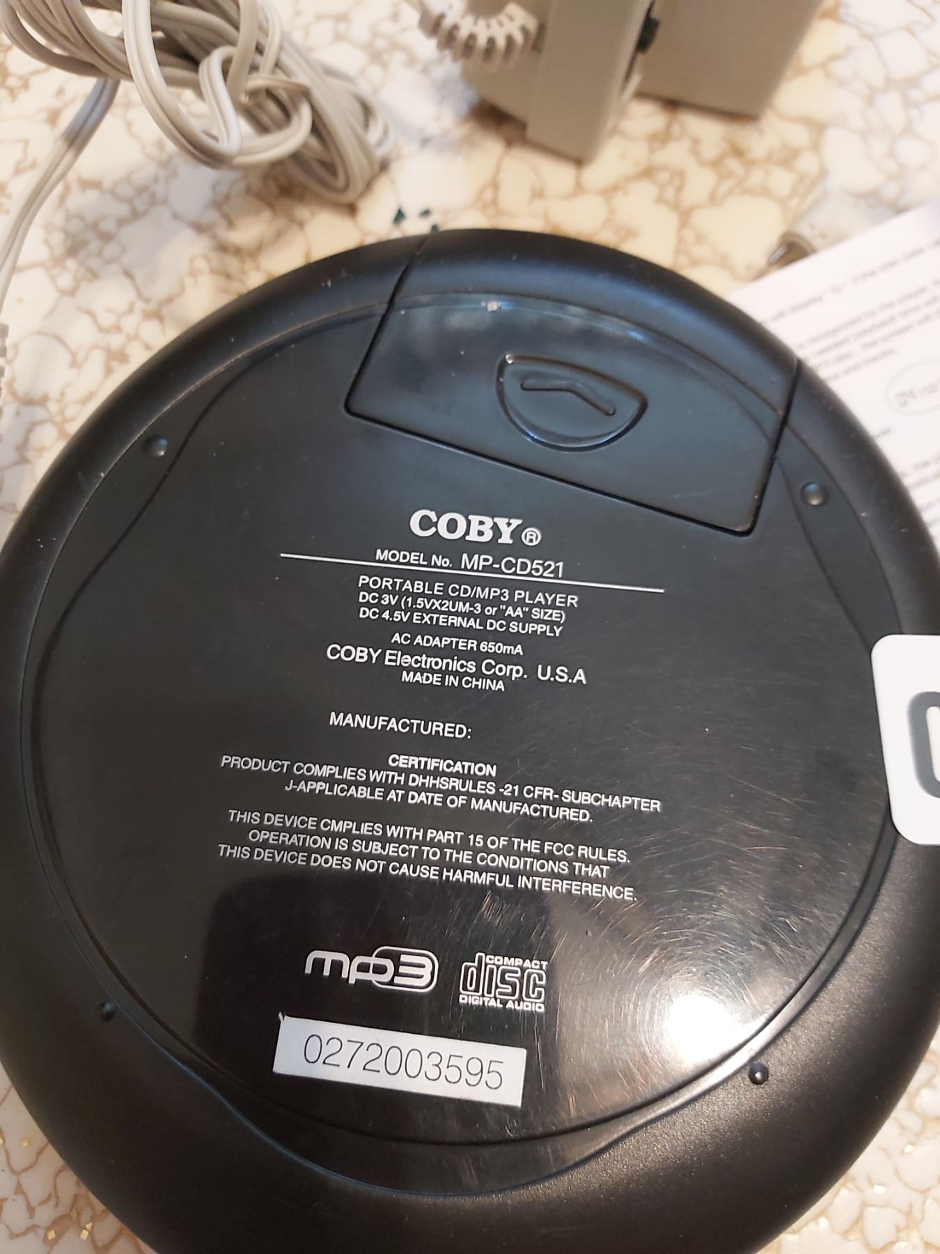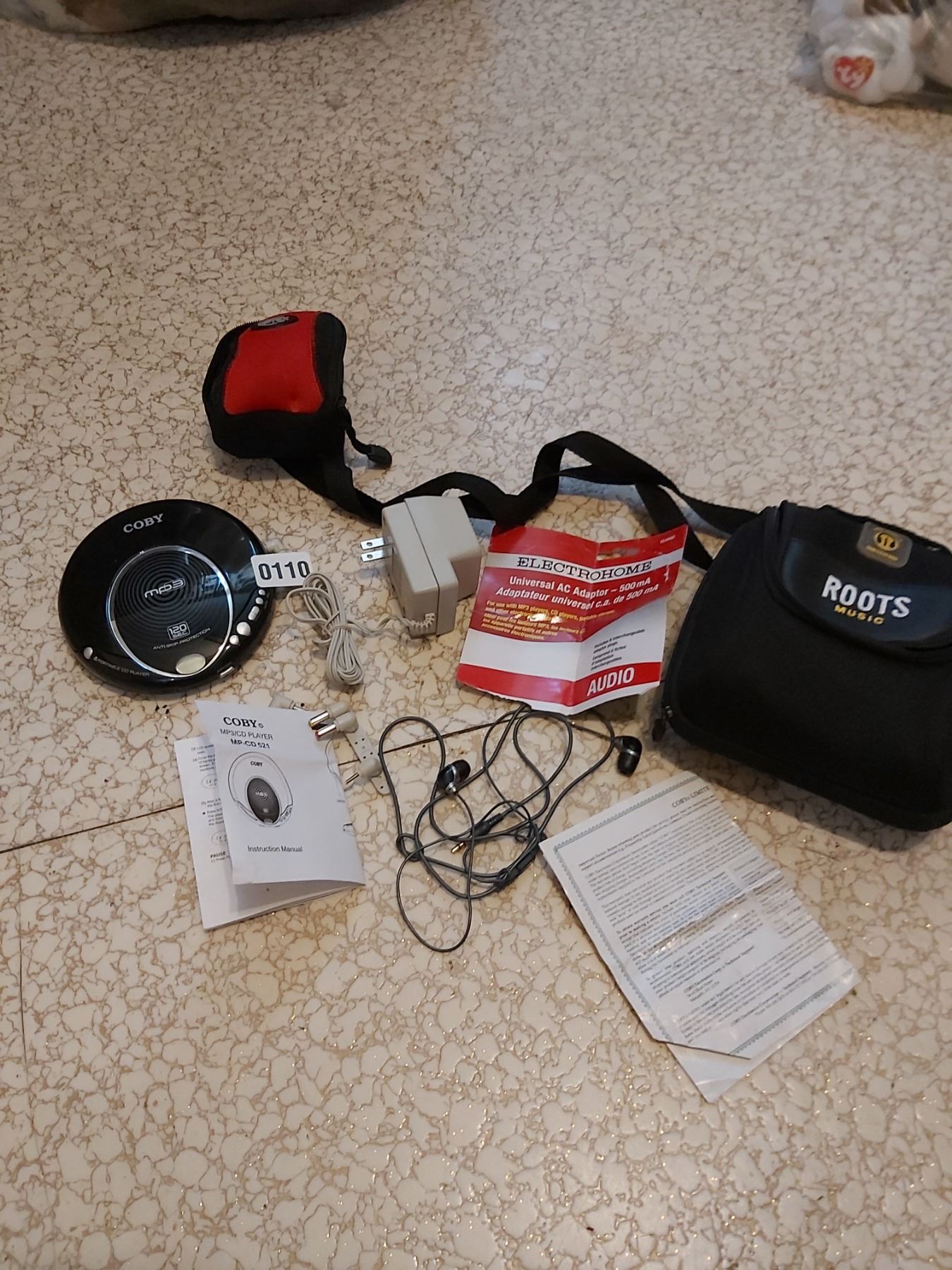 Coby MP 3/CD player (model MP-CD-521) with Electrohome universal AC adapter and bags