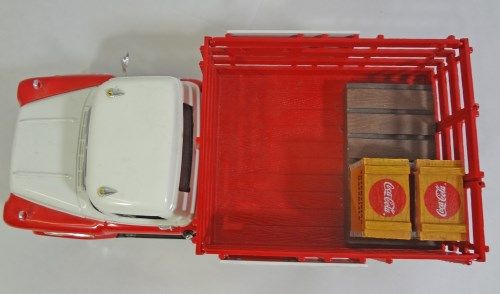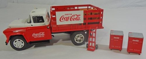 Coca-Cola Ertl 1957 Chevy Stake Truck Bank, w/ two coolers and a dolly.