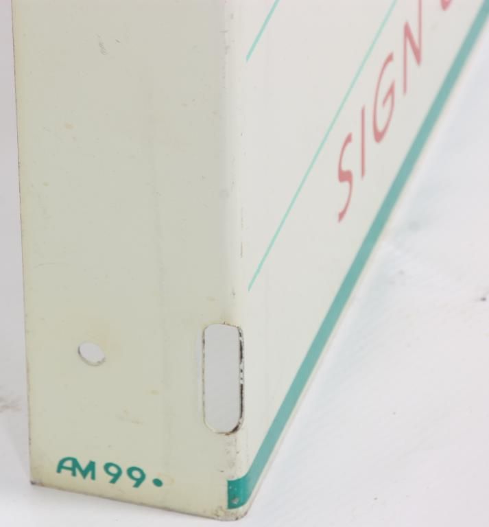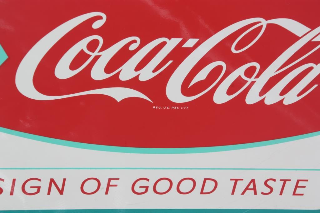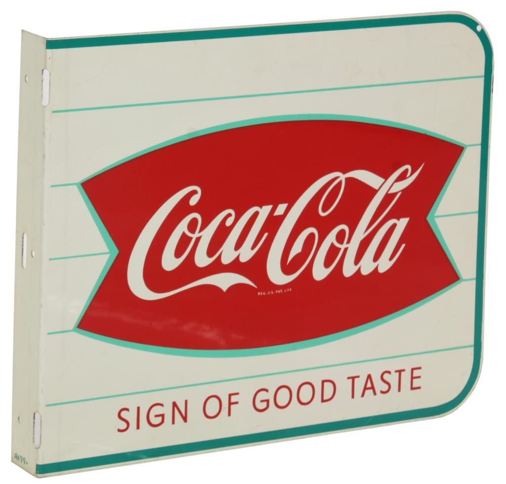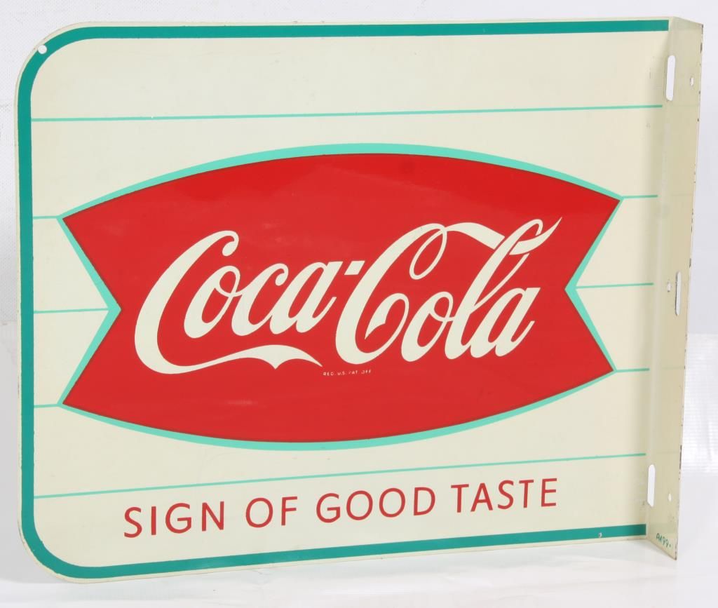 Coca-Cola 2 Sided Wall Sign. Wall mounted sign is enamel painted with cream colored background and teal pinstripes, has the Coca-Cola logo in a red fishtail shaped banner over red lettering that reads “Sign Of Good Taste”. In good condition, has a few minor surface scratches and edge chips to the paint. 15 in. high x 18 in. wide x 2 in. deep.