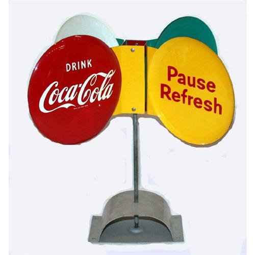 Coca-Cola Counter Spinner advertising sign. Four double-sided ads spin around to advertise Coke. Attached to counter with screws. Circa 1950's. Great condition.