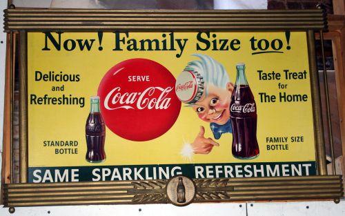 Coca Cola Advertising Sign promoting Coke in standard size and family size bottles. Cardboard sign in gold colored, fluted wooden frame with embossed Coke bottle at bottom. Overall framed size approximately 26" x 40". Copyright 1955, Litho USA. Good condition.