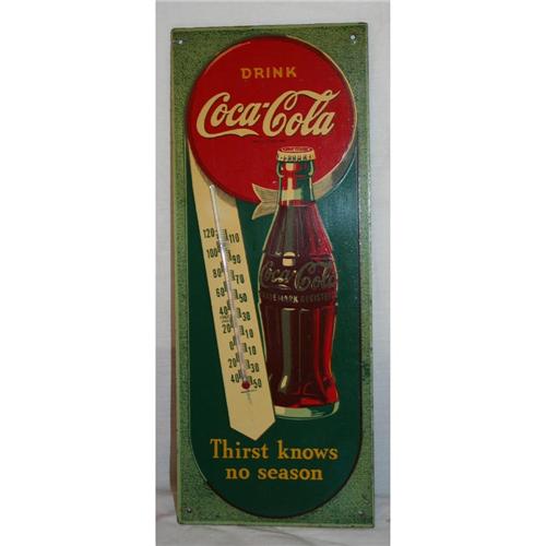 Coca-Cola Advertising Thermometer in green hardboard with round Coca-Cola logo and brown Coke Bottle.  Measures approx. 7" x 17" H.  Thermometer appears to be working properly.  Few surface scratches.  Overall good condition.  Circa 1941.