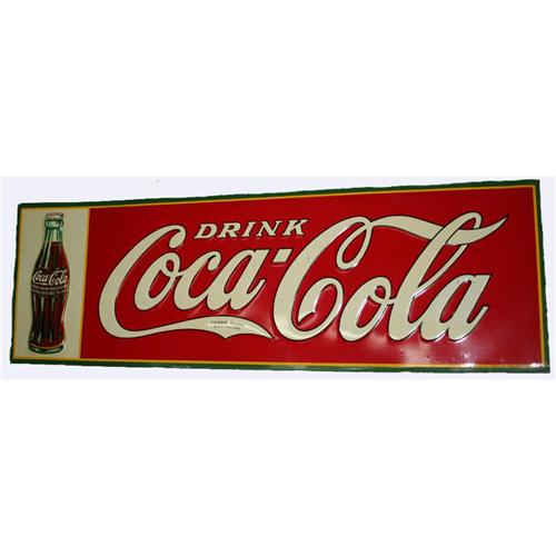 Tin Advertising Sign - Drink Coca-Cola in Script with Bottle. Measures approximately 11 ½" x 39" W. Excellent condition.