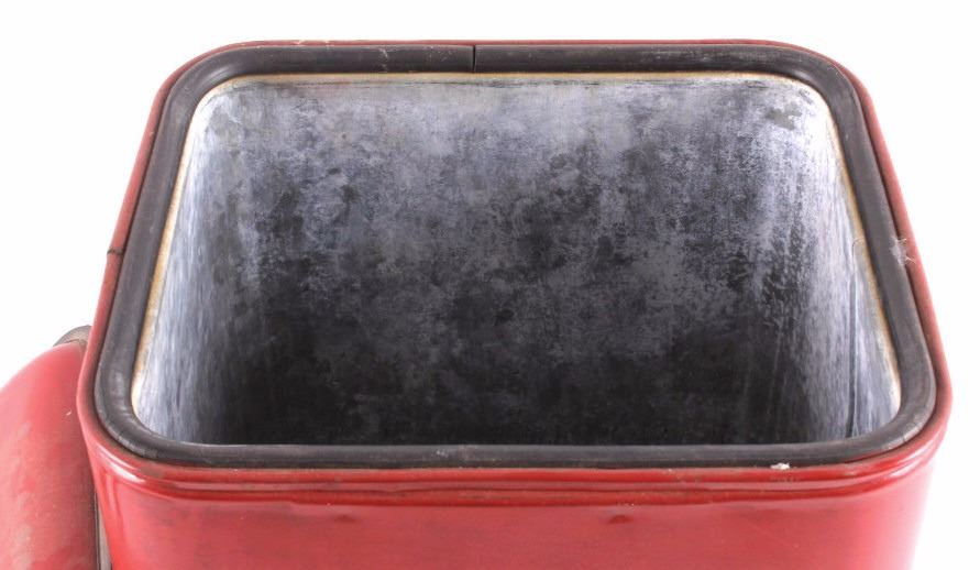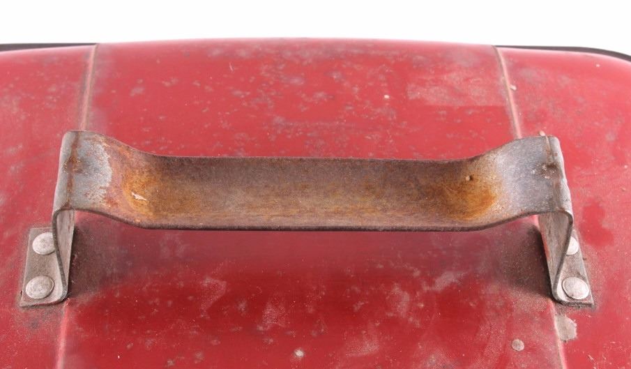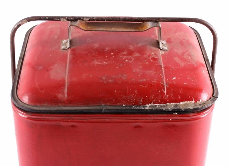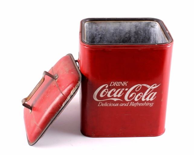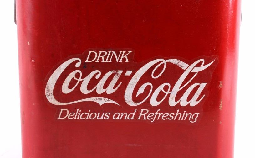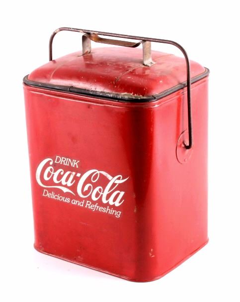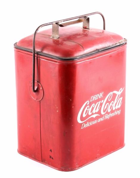 This is a Coca Cola advertising beverage cooler. The cooler shows a repainted finish with a decal that reads "Drink Coca Cola Delicious and Refreshing". The inside of the cooler is insulated with a galvanized lining. The Coca Cola cooler is in good overall condition. It measures 9" x 11.5" and is 15.5" tall.
