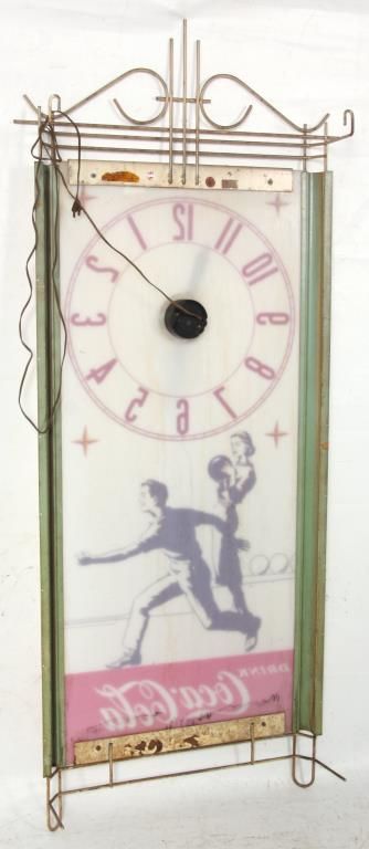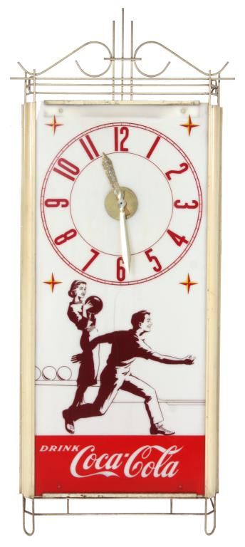 Coca-Cola Advertising Bowling Clock. The clock has a tin frame with iron wire top and bottom crests; the large white plastic panel is obverse decorated and lights up from the reverse, has an electric clock with 19 in. chapter ring with Arabic hour numerals and gilt metal hands, decorated below with a man and woman bowling and a red “Drink Coca-Cola” logo at the bottom. Made by Price Bros. Inc. In good condition with no breaks or cracks. 65 in. high x 25.5 in. wide.