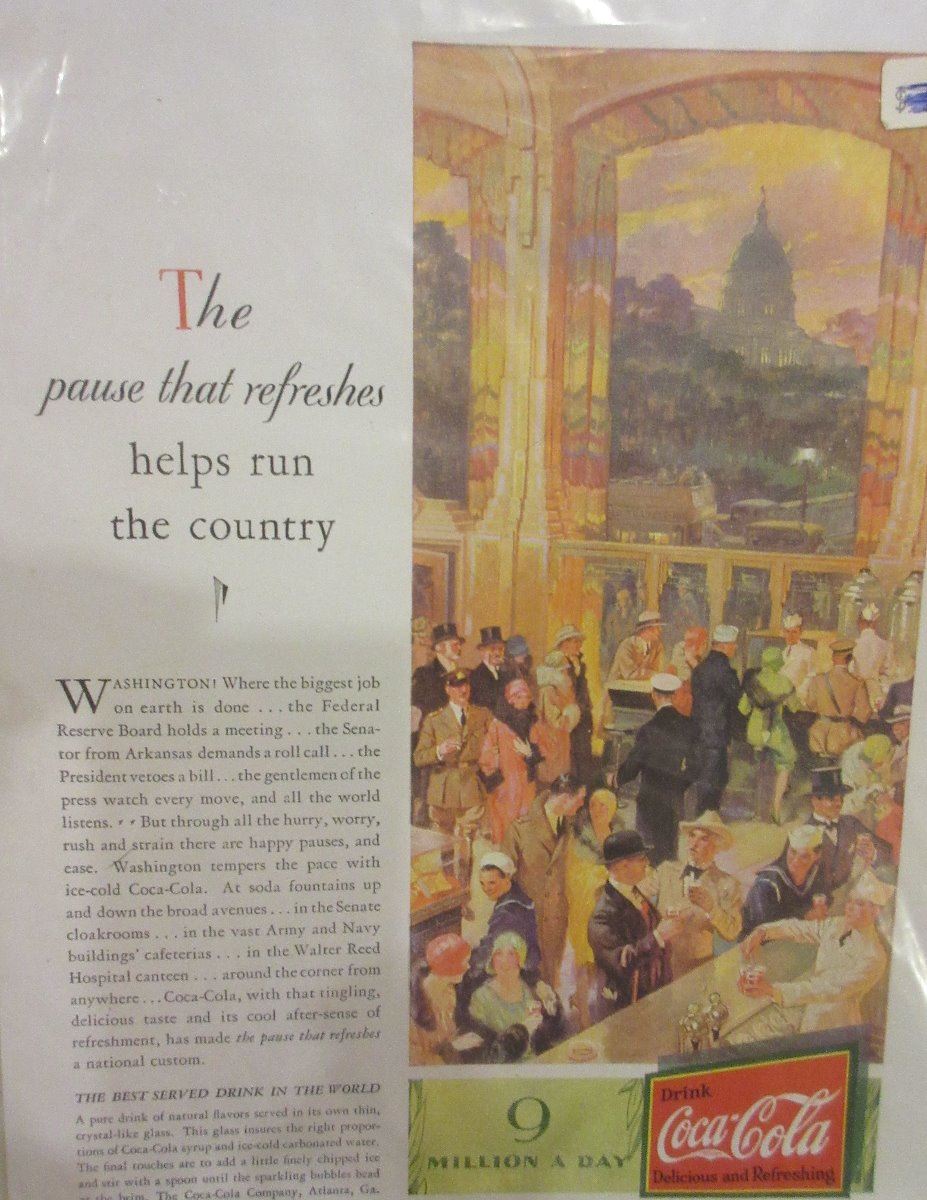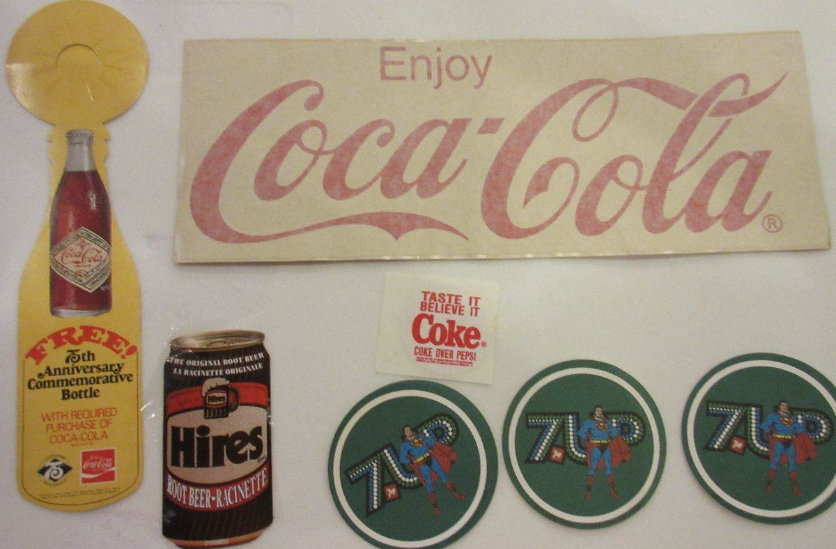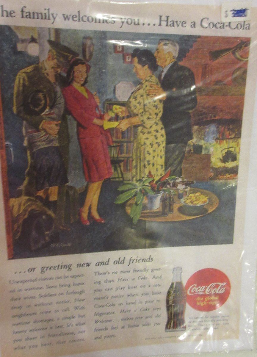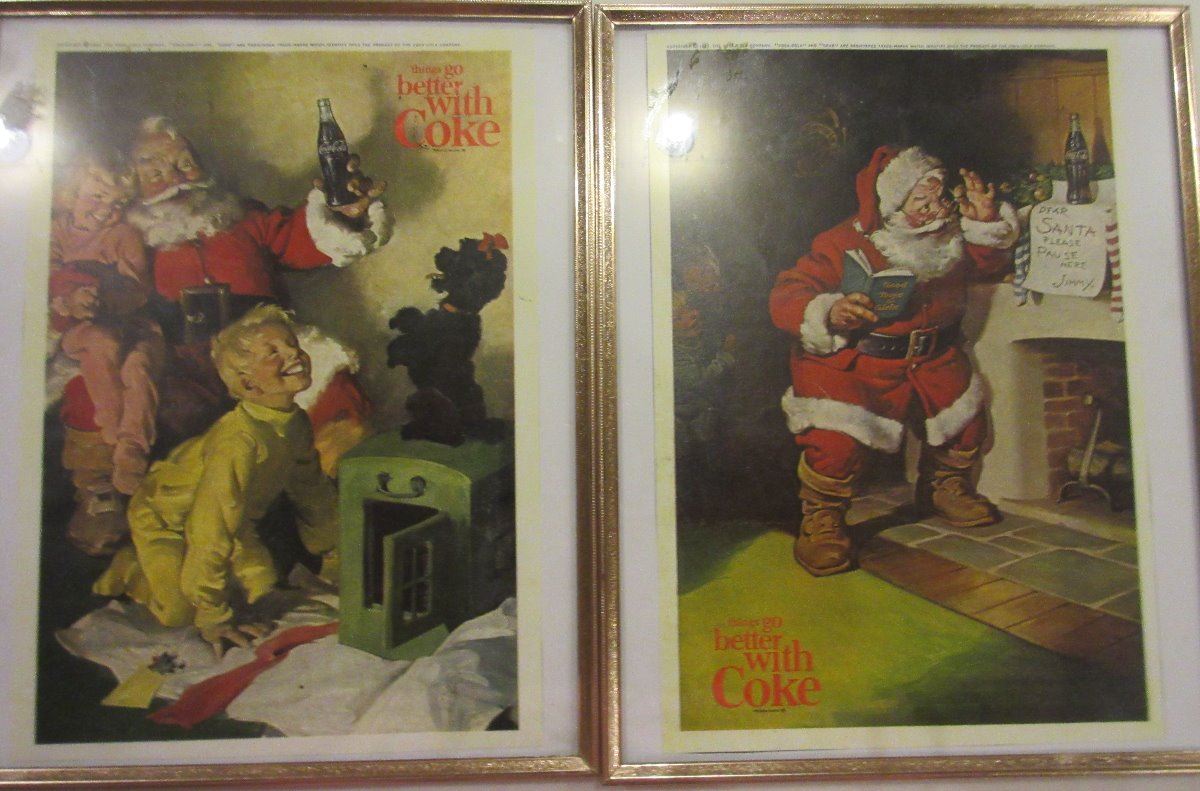 2 Framed Coca Cola Advertising Newspaper, Christmas Plastic Advertise Tray 75th Anniversary 1904 - 1979, 2 postcards 1977 Pictures from the Archives 1) World Peace 1950 2) New Formula for Coca Cola 1985 , Ink Blotter Coke knows No Season Date of 1947 in bottom right hand corner, Coasters 7 up. Coca Cola Hang tags for 75th Anniversary, Hires Root Beer, 4 Magazine Advertising one is from Ladies Home Journal April 1931