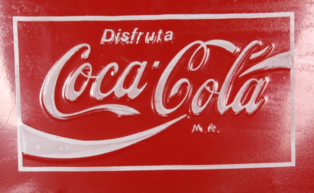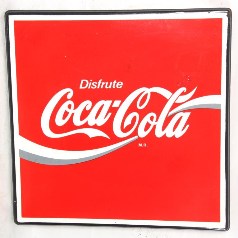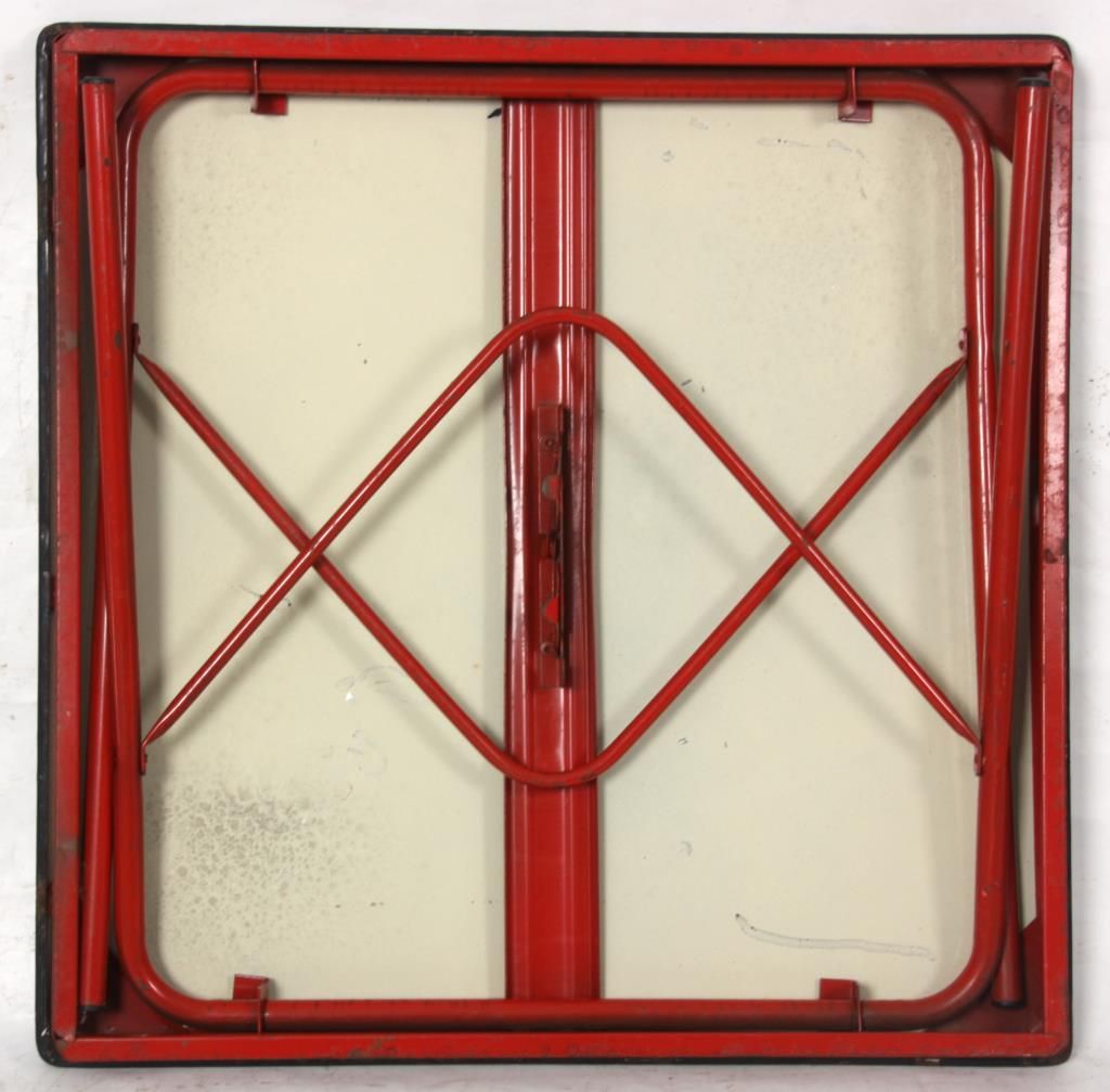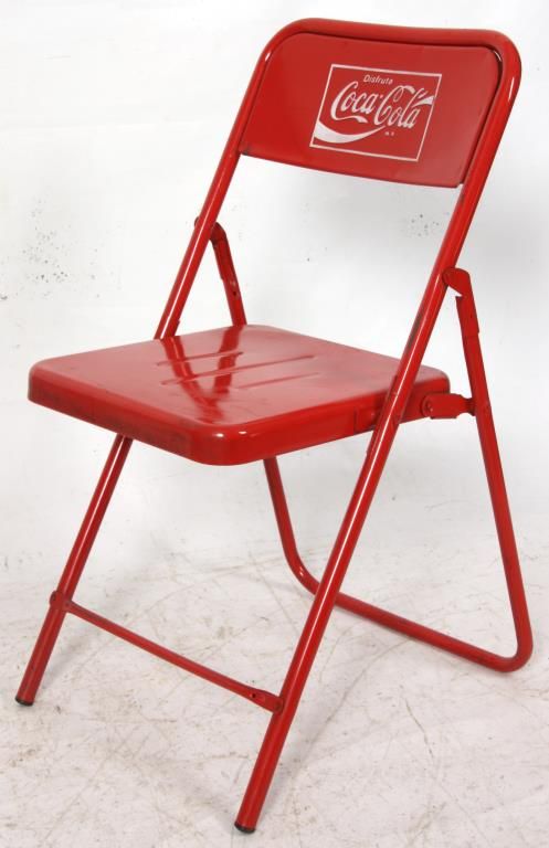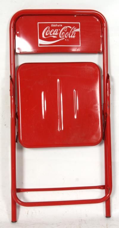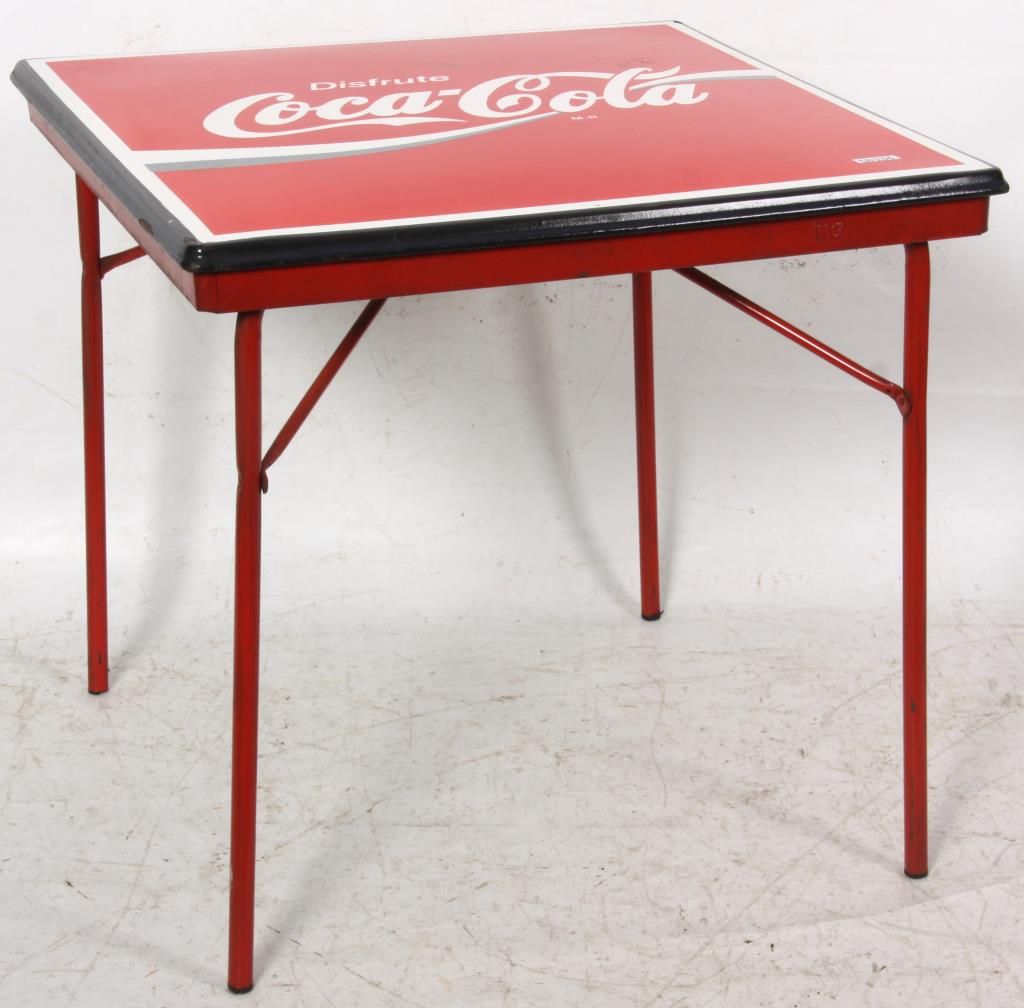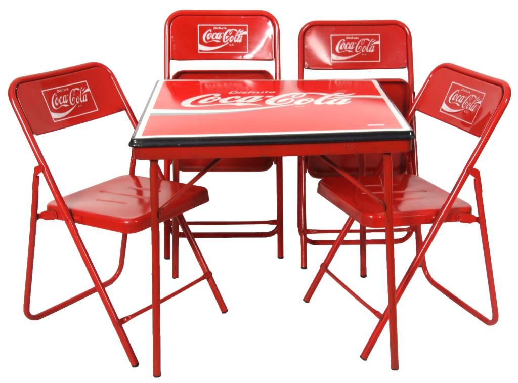 Coca-Cola Advertising Table & Chairs. Red painted folding table with white borders and “Disfrute Coca-Cola MR” logo on the top; with 4 red painted folding chairs with Coca-Cola logo pressed and painted white in the back rest. Original paint and good overall used condition. Table is 27.5 in. high x 29.5 in. wide x 29.5 in. deep. Chairs are 30 in. high x 17 in. wide x 17 in. deep.