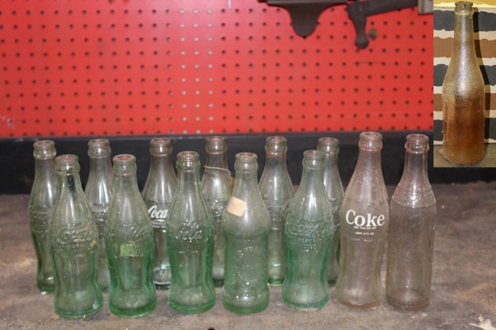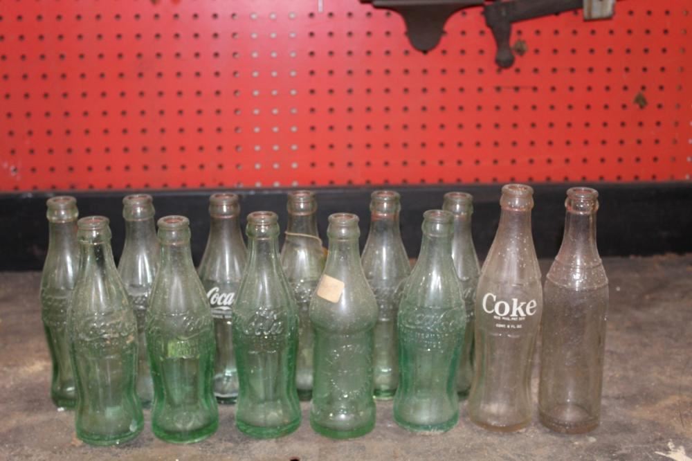 Vintage Coca-Cola Bottles, approx. 13 and orange iridescent bottle.