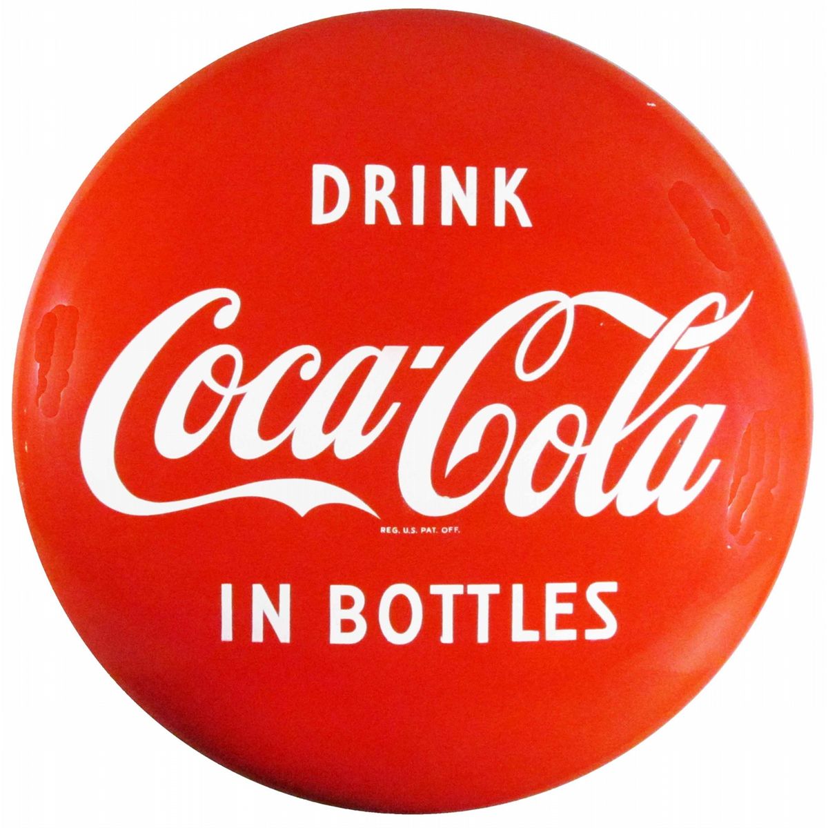 Coca Cola Button Sign. Chips at mounting holes otherwise near mint condition. 24 inch diameter.